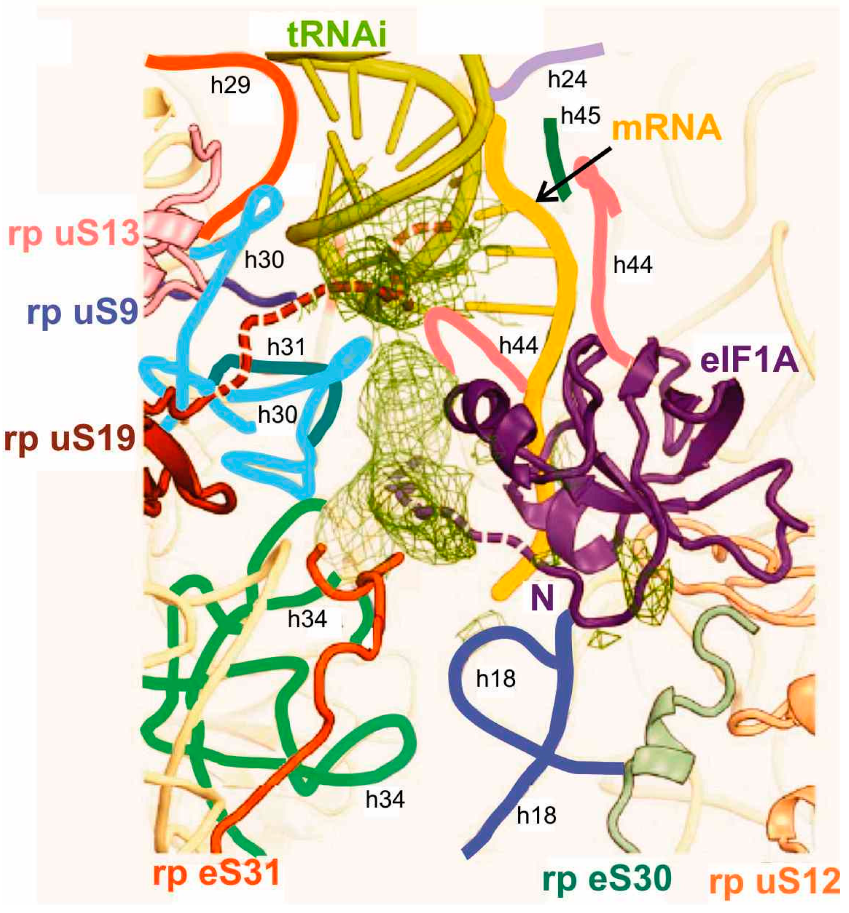 Binding pocket for the codon-anticodon duplex at the P site of the model mammalian 48S PIC [21]. Proposed locations of the C-terminus of rp uS19 (brown) and N-terminal tail of eIF1A (violet) are shown as dashed lines. Helices (h) of the 18S rRNA are marked with individual colors and designated with small letters.