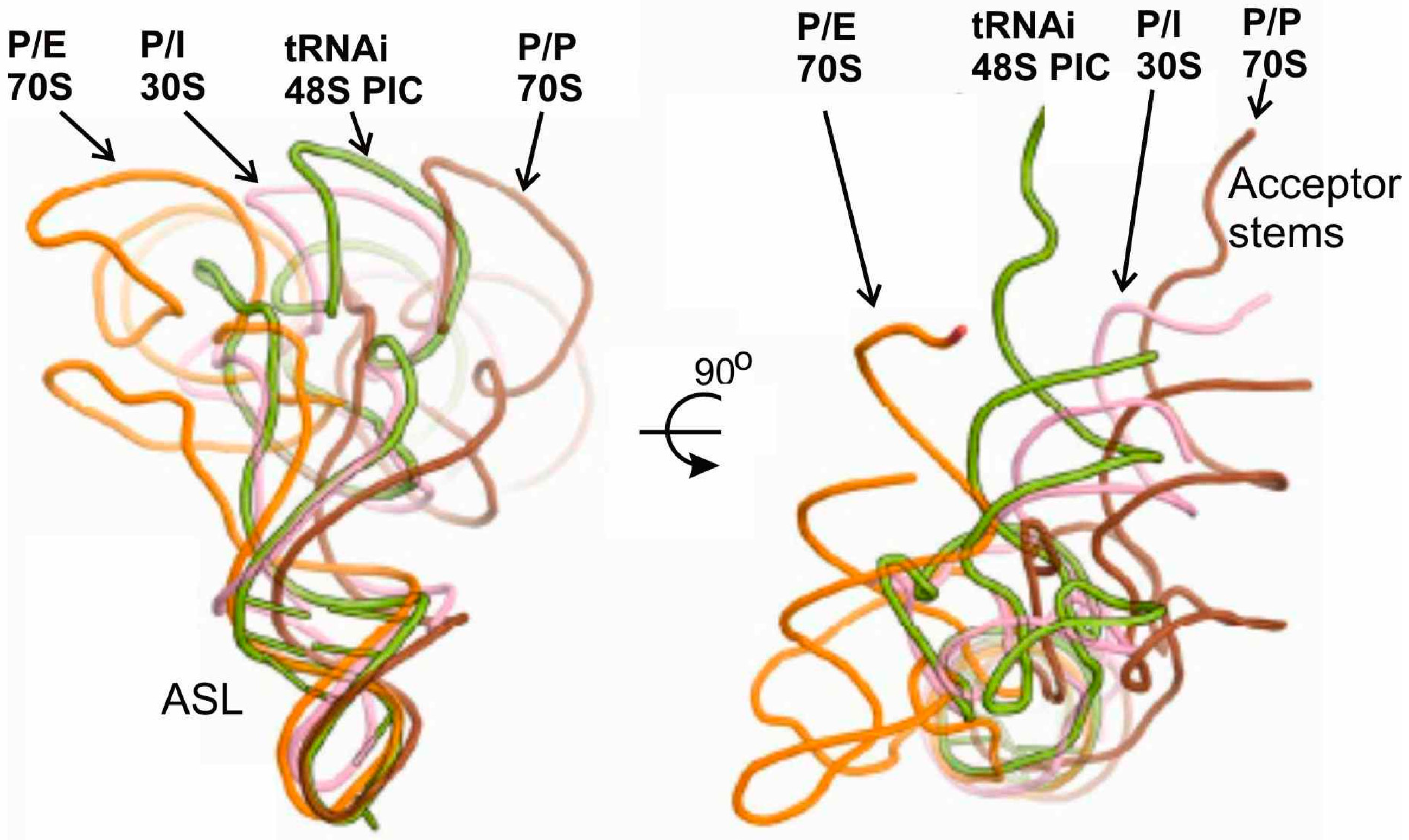 Comparison of positioning of tRNA in the P/I state in the 48S PIC with that in the bacterial 30S IC and with those in P/E and P/P states in the 70S complexes [21].