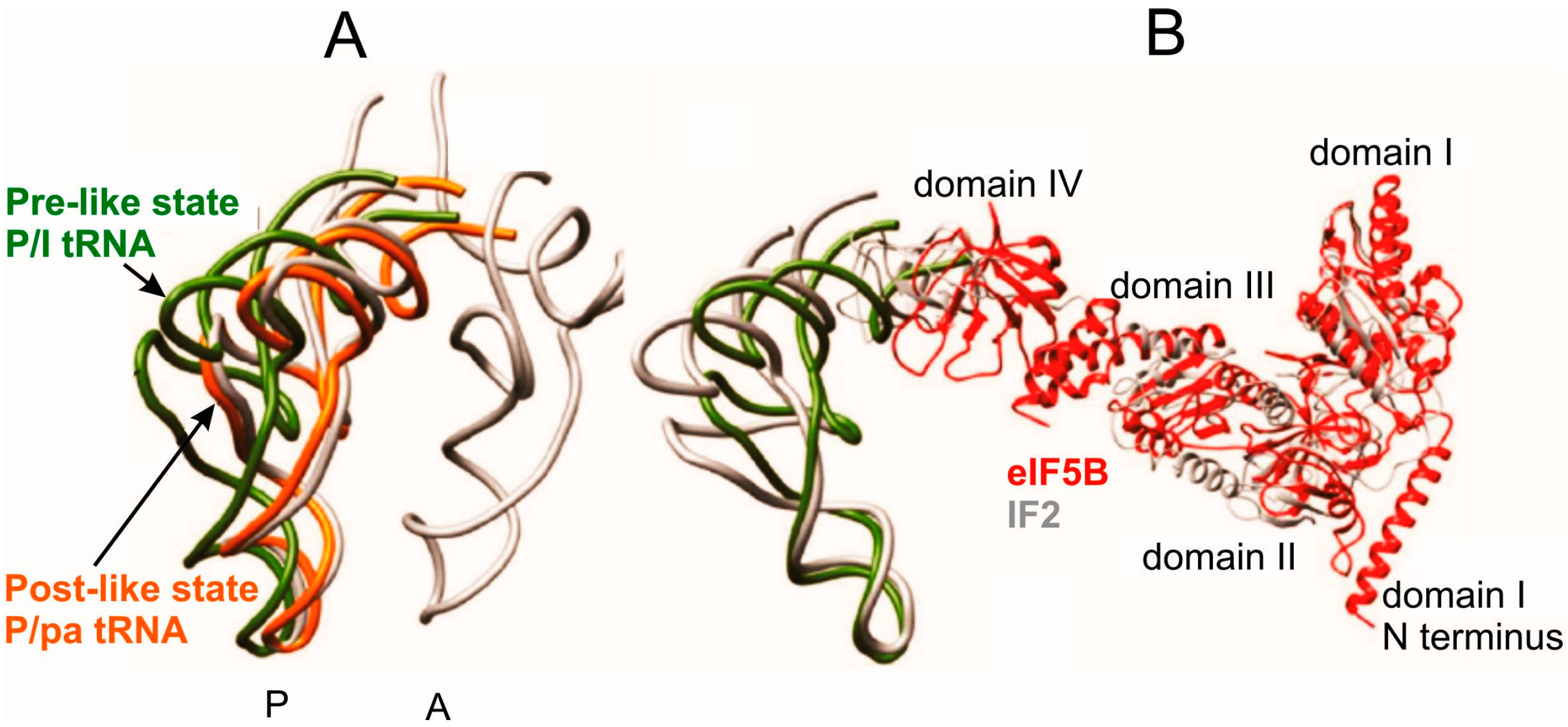 Comparison of tRNA positioning in the Pre-like and Post-like states of the 80S initiation complex with that in classical A and P sites [19]. (A) configurations of P/I-tRNA in the Pre-like state (green), P/pa-tRNA in the Post-like-state (orange) and classical A/A-tRNA and P/P-tRNA (gray); (B) comparison of the positioning of Met-tRNAiMet and eIF5B (red) within the mammalian Pre-like state and that of IF2 and fMet-tRNAfMet within the bacterial initiation complex (gray).