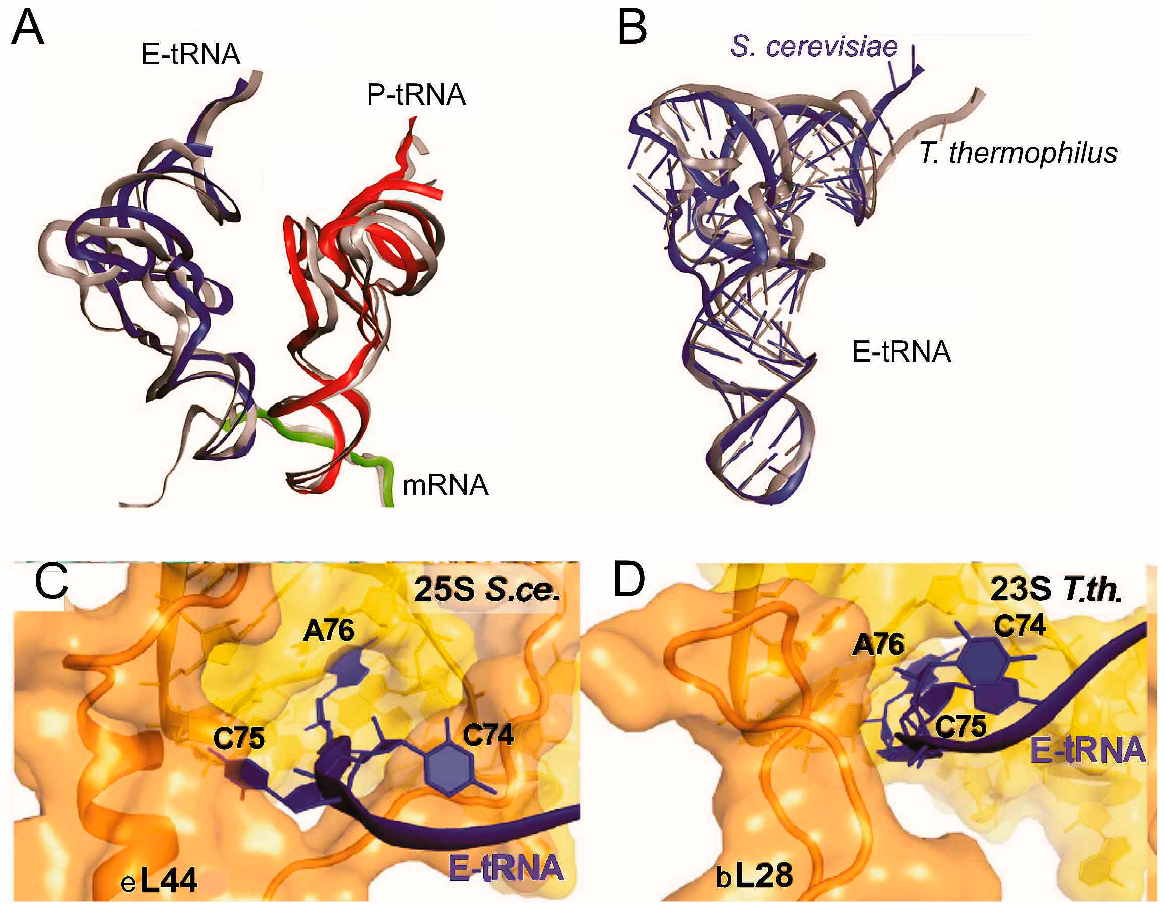 Structural differences between positioning of tRNA in yeast and bacterial POST-like complexes [18]. (A) conformational and positional differences between tRNAs bound to yeast (red and dark blue) and bacterial T. thermophilus ribosomes (gray); (B) conformational difference between E-site tRNAs bound to yeast (dark blue) and bacterial (gray) ribosomes; (C,D), differences between arrangements of the CCA-termini of the E site tRNAs bound to the yeast (S.ce.) and Thermus thermophilus (T.th.) ribosomes.