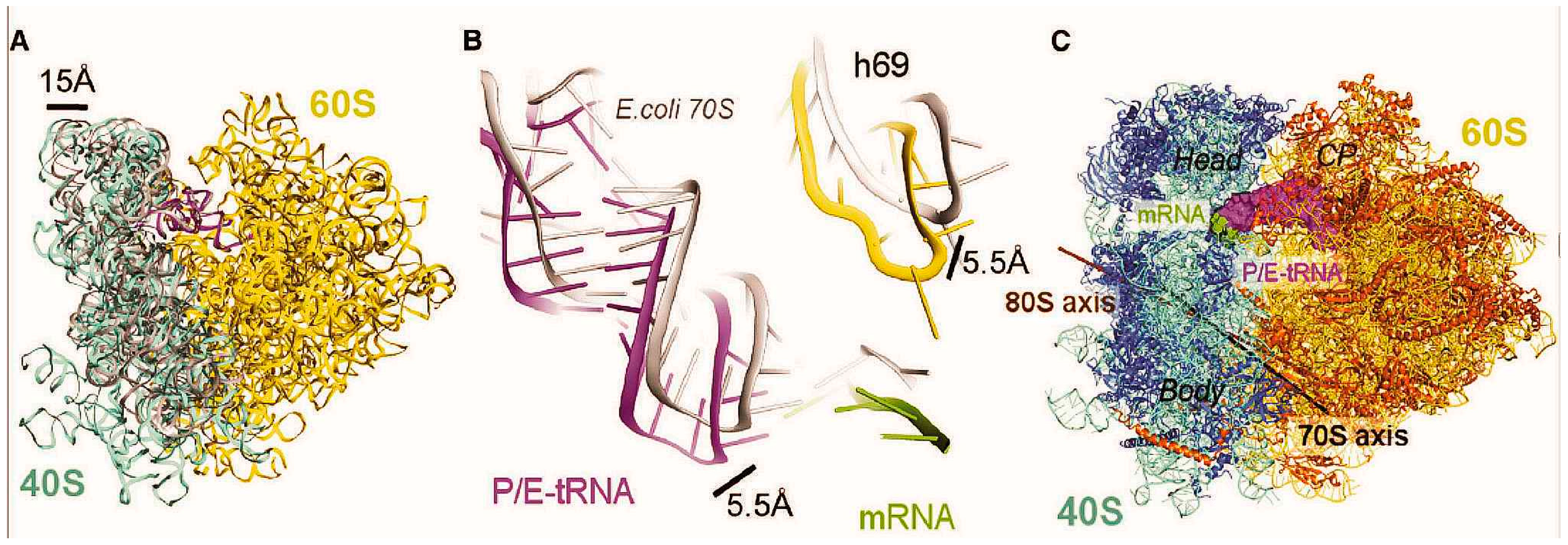 Differences in the conformations of rotated yeast 80S and bacterial 70S ribosomes in the complex with P/E-site tRNA [18]. (A) The tilt of the small 40S subunit relative to the large 60S subunit resulting in the shift of the head of the small subunit away from the core of the 60S subunit by up to 15 Å. 18S and 25S rRNAs in the rotated yeast ribosome are shown in blue and yellow, respectively; E. coli 16S rRNA of the 30S subunit in the analogous bacterial complex is shown in gray; (B) Differences in positions of the tRNA, mRNA, and helix 69 between the rotated yeast and E. coli ribosomes. Components of the bacterial complex are presented in gray; (C) Intersubunit rotation axes for yeast (brown) and E. coli (black) ribosomes (CP, central protuberance of the large subunit).