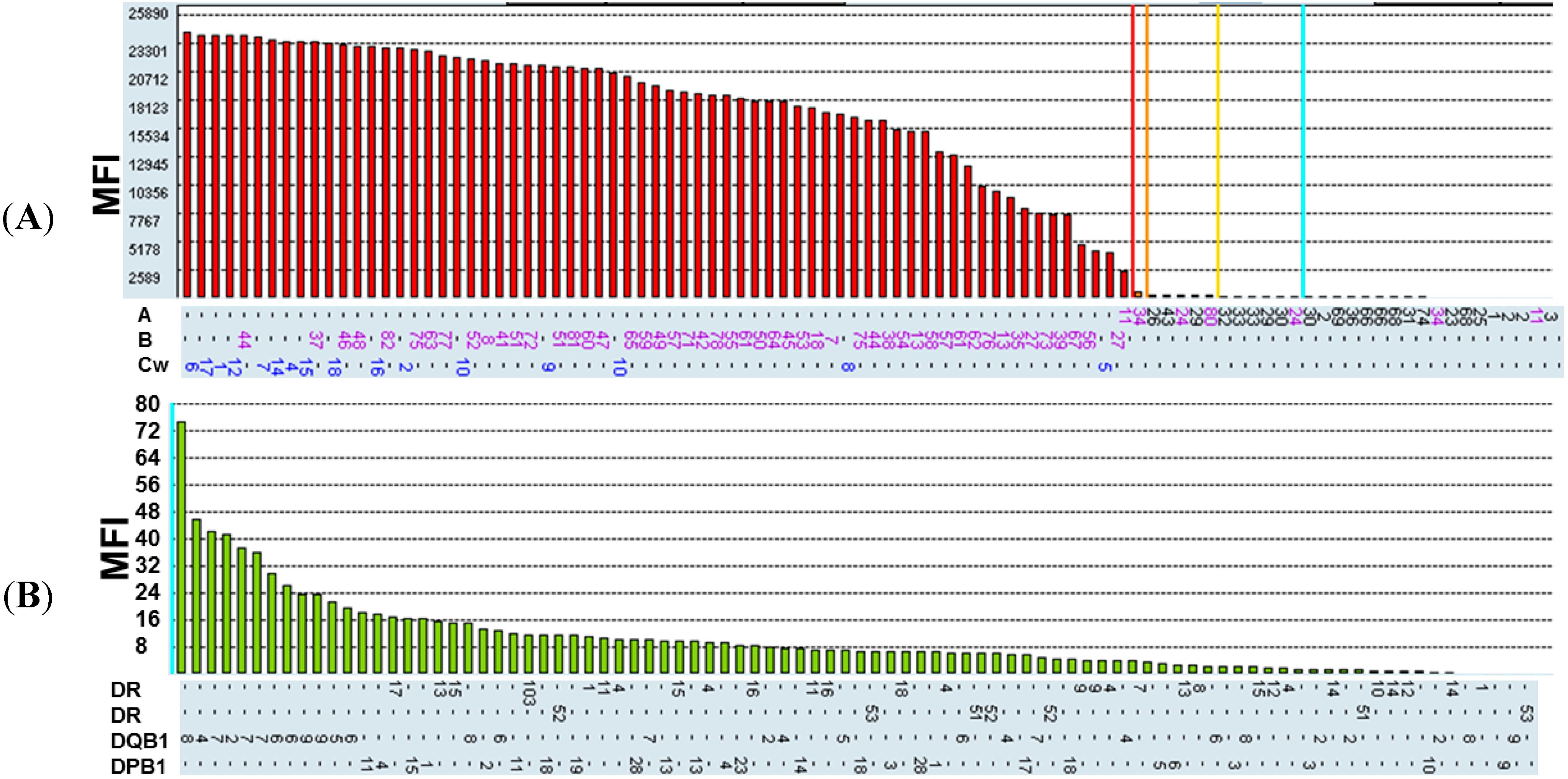 Characterization of binding specificity for BH2 by human leukocytic antigen (HLA)-typing. (A) Analysis of BH2 binding to major histocompatibility complex (MHC) class I molecules by using the Luminex Technology. MFI represents mean fluorescence intensity. Cut-off values of mean fluorescence intensity (MFI) for positive binding were set at 637; (B) Analysis of BH2 binding to MHC class II molecules by using the Luminex Technology. Cut-off values of MFI for positive binding were set at 500.