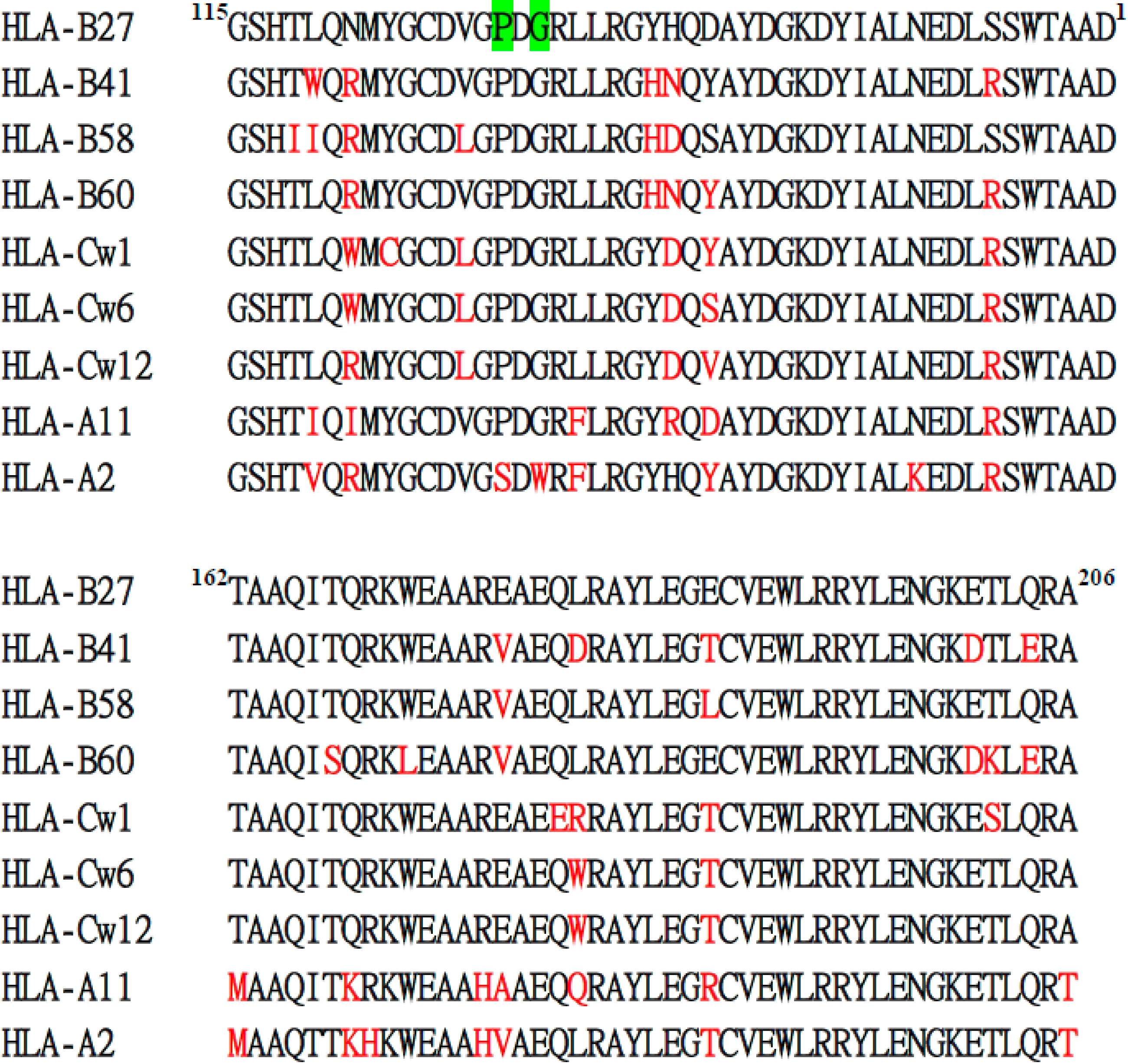 Amino acid sequence alignment of HLA-B27 HC α2 domain with that of the indicated HLA-B, -C, and -A molecules. BH2 binds to HLA-B27, -B41, -B58, -B60, -Cw1, -Cw6, -Cw12 and -A11, but not to HLA-A2 in HLA-typing assay. The non-consensus residues compared with HLA-B27 are marked with red. Double replacements of Pro-129 and Gly-131 of HLA-B27 HC with Ser and Trp, respectively, are marked as green.