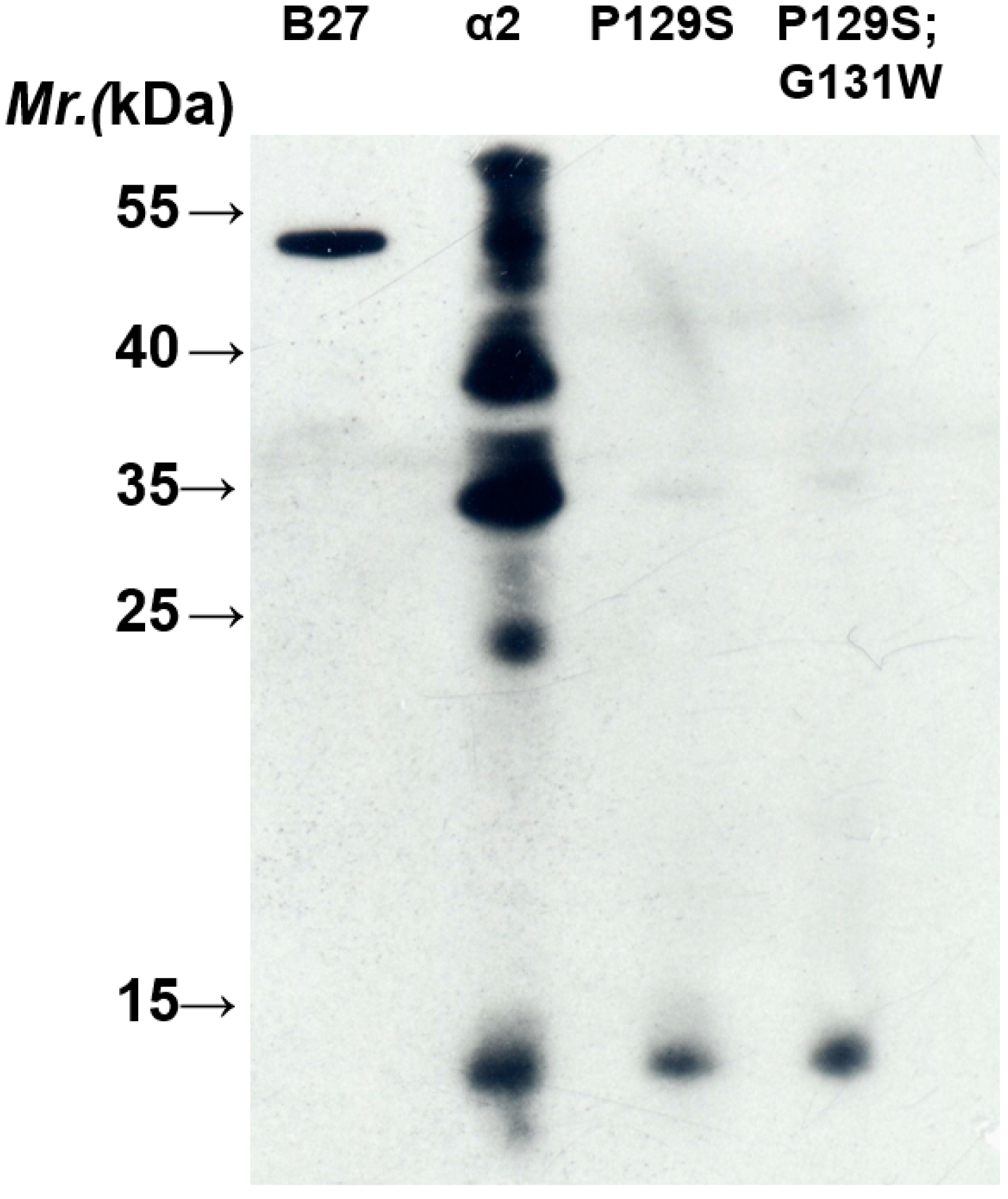 Double replacements of Pro-129 and Gly-131 with Ser and Trp, respectively, on the α2 domain do not affect the BH2-binding. An aliquot (20 µg) of each crude protein extracted from E. coli bacteria that have overexpressed the indicated mutant α2 domain of HLA-B27 HC was separated by SDS-PAGE (15%) and analyzed by western blotting using BH2 monoclonal antibody.