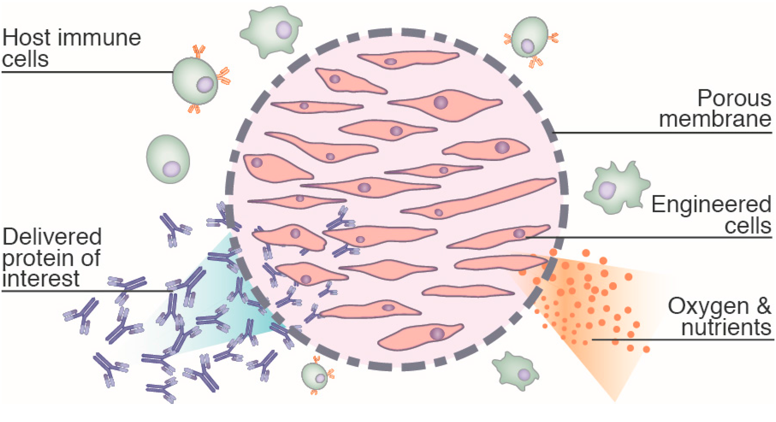 Two different approaches have been developed to encapsulate cells. With “microencapsulation” technology, cells are enclosed in capsules with a sub-millimeter size, each containing a cluster of a few thousand cells. The “macroencapsulation” format is based on the utilization of large biocompatible polymer devices, with a size typically in the centimeter range, and which contain several million cells. Macroencapsulation devices can be retrieved to halt the treatment and allow for better control over the dose of biomolecules administered. Therefore, we will focus on macroencapsulation, which is the most advanced format for the applications discussed in the present review.
