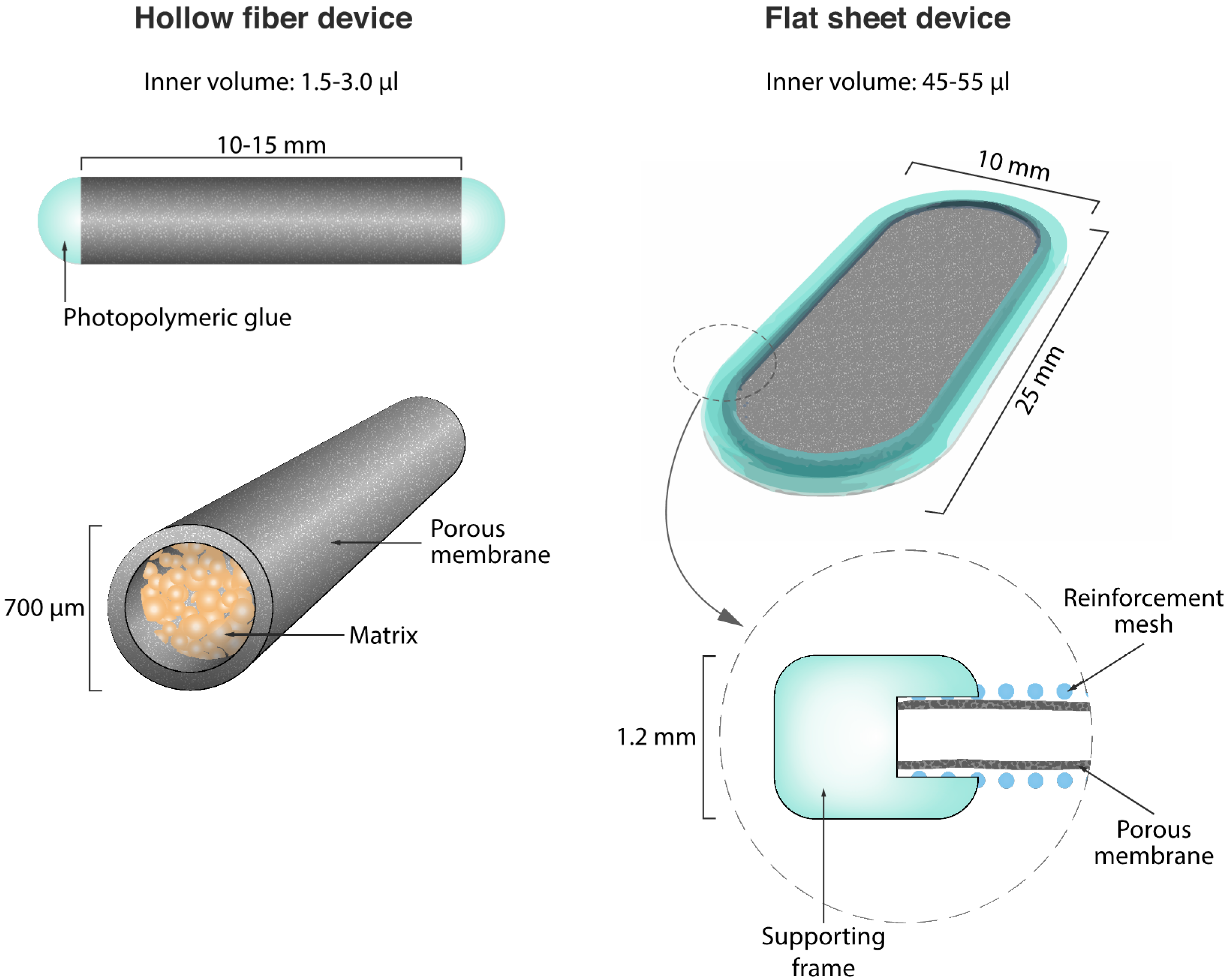 To adapt several million cells, macrocapsules require rational design optimization. For instance, a spherical geometry cannot be considered for individual capsules, as it fails to maximize the passive diffusion of factors essential for cell survival, such as oxygen and nutrients. Instead, the main geometries are either cylindrical hollow fibers or planar diffusion chambers (Figure 2). Hollow fiber devices usually consist of a manufactured porous membrane, which can be sealed using photo-polymerizing medical glue once the cells are loaded inside the fiber lumen. The device is typically linked to a tether to facilitate explantation. Hollow fiber devices are well adapted to implantation into the eye [12], the subcutaneous tissue [13] and the CNS, either intrathecally [5] or intraparenchymally [14]. Hollow fibers have also been directly connected to the host bloodstream by establishing an arterio-venous anastomosis. In this system, the grafted cells are confined in an external chamber lining the permeable membrane, and are therefore maintained near the bloodstream to facilitate molecular exchanges [15]. However, intravascular devices were associated with a high risk of hemorrhages and thromboembolic events, which necessitates chronic administration of anticoagulants. Therefore, the FDA has stopped their development [16].