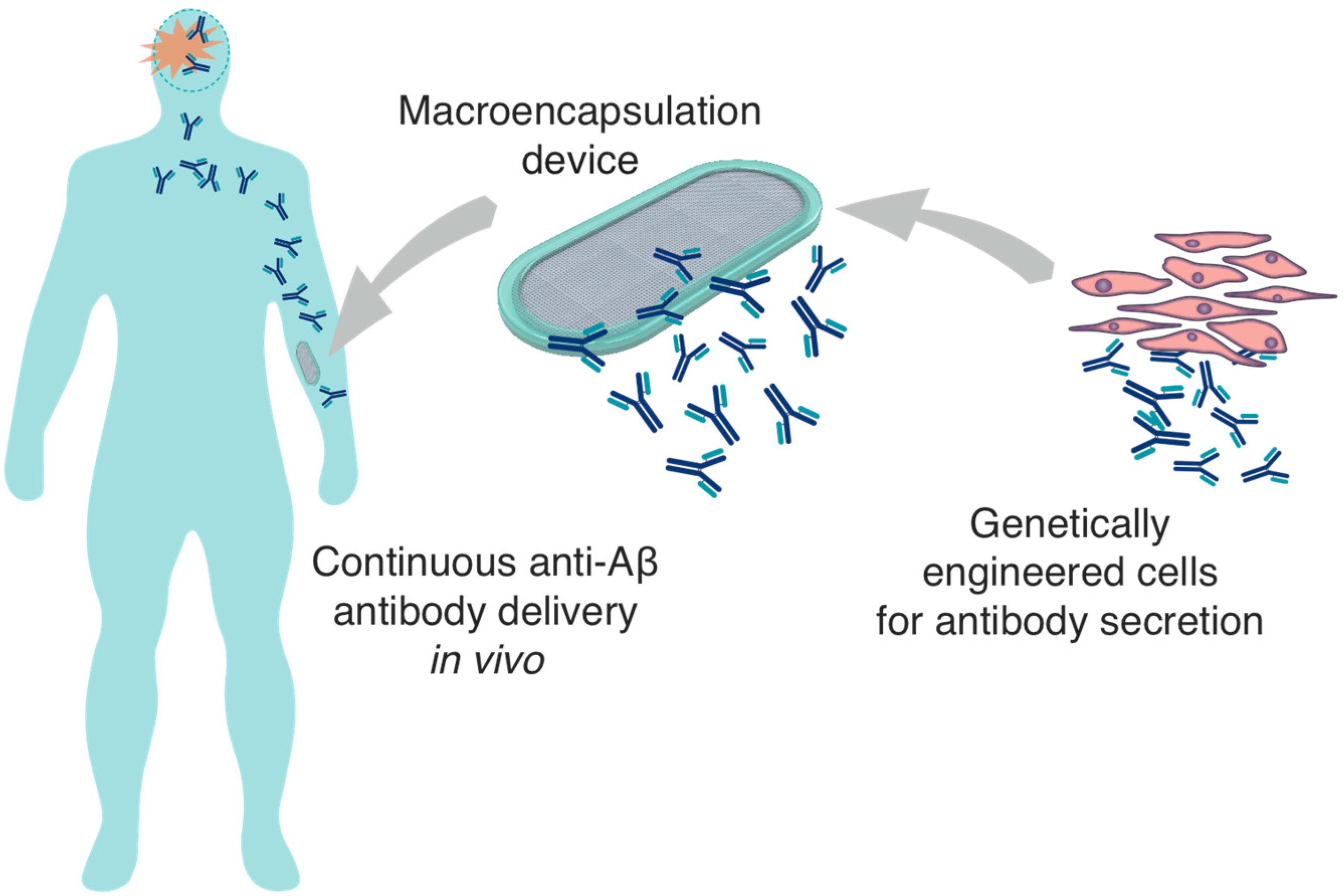 An alternative strategy with a less invasive implantation procedure would be better adapted to disease prevention in patients at risk of AD. A possible approach is to implant the encapsulated cellular implant in the subcutaneous tissue, for the systemic delivery of the therapeutic mAb, with the aim of inducing the clearance of the amyloid pathology in the brain (Figure 3). To establish such an approach, several major technical challenges have to be overcome: (i) it is critical to generate stable cell lines suitable for ECT and that secrete significant amounts of anti-Aβ antibodies; (ii) a large capacity cell encapsulation device has to be developed that can support the long-term survival of the implanted cells in the subcutaneous tissue; (iii) it is important to demonstrate that the implanted ECT device can secrete anti-Aβ antibodies for several months, reaching therapeutic levels of recombinant antibody measurable in the plasma, to ultimately achieve beneficial effects on brain amyloid pathology. Our recent work has focused on the rational development and optimization of methods to demonstrate the feasibility and efficacy of this approach.
