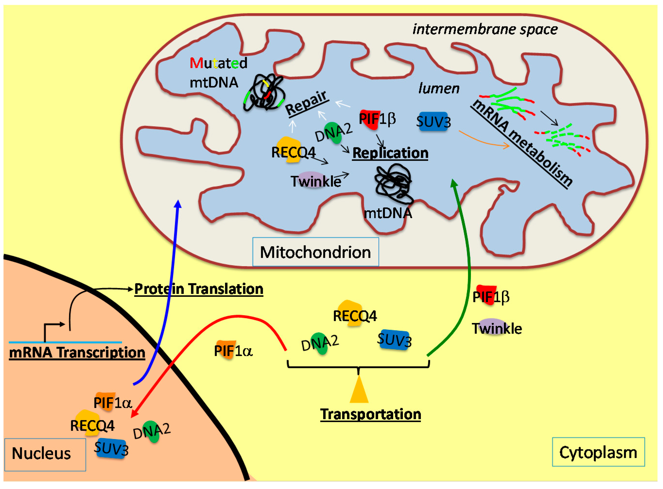 Schematic diagram of the production and the cellular localization of the DNA helicases (Twinkle, purple; RecQ-like helicase 4 (RECQ4), yellow; DNA replication helicase/nuclease 2 (DNA2), green; petite integration frequency 1 (PIF1), red; suppressor of var1 3-like protein 1 (SUV3), blue) that function in the mitochondrion. These DNA helicases are encoded in the nuclear genome, produced in the cytoplasm and transported into the mitochondrial lumen. With the exception of Twinkle, other DNA helicases, including RECQ4, DNA2, PIF1 and SUV3, are transported into the mitochondrial lumen or nucleus depending on the molecular cue. In the mitochondrion, these helicases participate in DNA replication and repair, as well as mRNA metabolism, in order to maintain mtDNA stability.