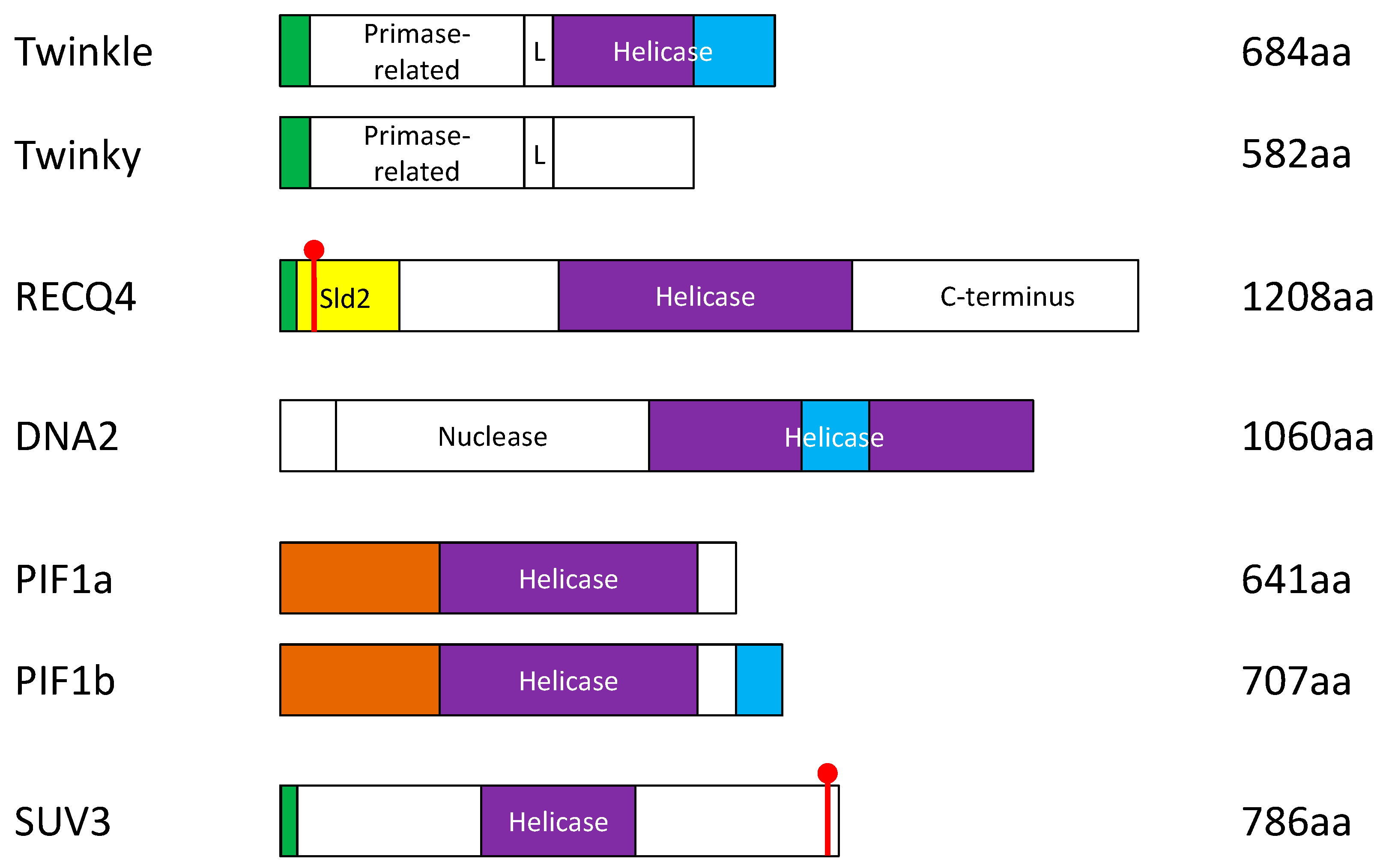 Schematic diagram of the protein domains and alternatively-spliced variants of the human DNA helicases that have known functions in the mitochondrion. Green: mitochondrial targeting sequence (MTS). Red: nuclear localization signal (NLS). Purple: helicase domain. Blue: non-MTS sequence required for mitochondrial localization. Brown: arginine-rich region where potential NLSs reside. Yellow: unique sld2-like domain. L = linker region.