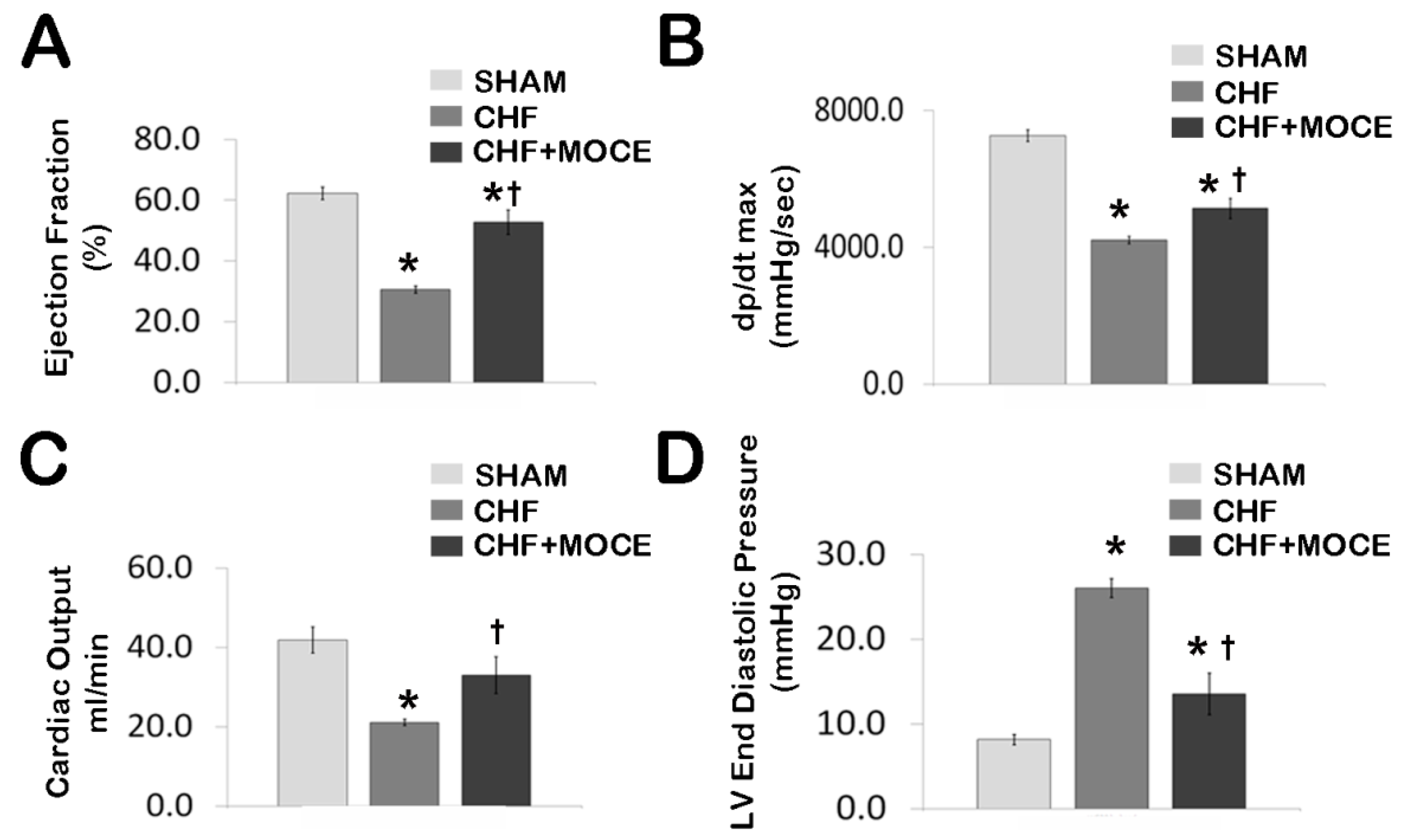 Mocetinostat improved cardiac function in CHF. Hemodynamic parameters were measured in sham, untreated and Mocetinostat (20 mg/kg)-treated CHF and presented in bar graphs; (A) Ejection Fraction (B) dp/dt max (C) Cardiac output (D) Left ventricle end diastolic pressure. Sham (n = 10), CHF (n = 10), CHF + MOCE (n = 10). Error bars indicate SE. *, p < 0.05 compared to sham; †, p < 0.05 compared to CHF; CHF, congestive heart failure; LV, left ventricle; dP/dtmax, peak rate of left ventricular pressure rise; MOCE, Mocetinostat.