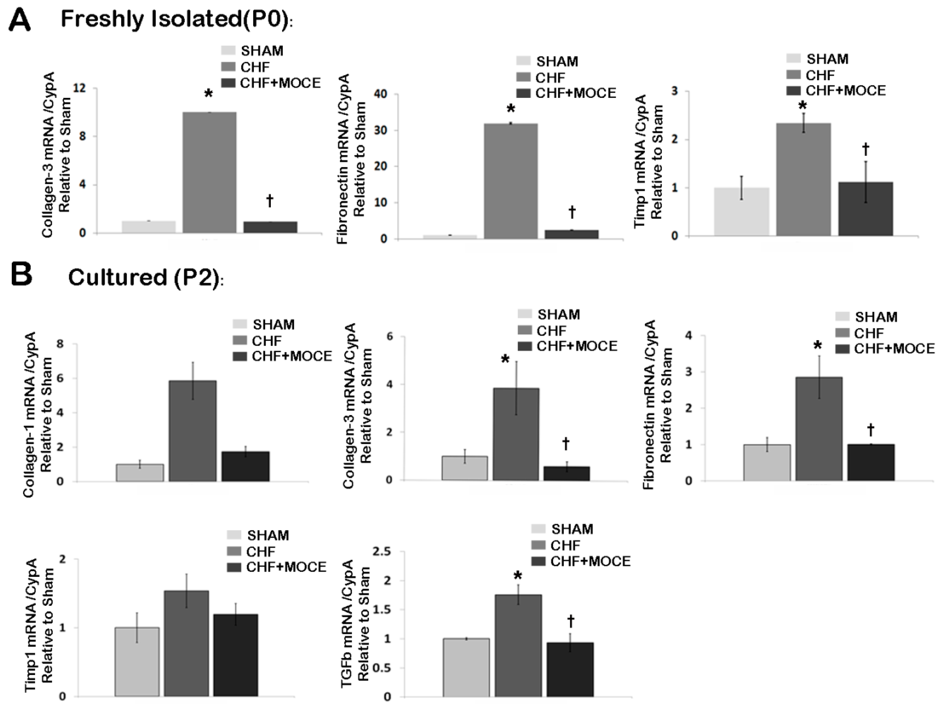 Mocetinostat reduced expression of ECM-related genes in endogenous cardiac fibroblasts. (A) Gene expression of collagen-3, fibronectin, Timp1 were measured with real-time PCR in CD90+ cardiac fibroblasts isolated from untreated and Mocetinostat-treated CHF hearts at P0 without culturing in in vitro; (B) Gene expressions of collagen-3, fibronectin, and TGFβ were measured with real-time PCR in cultured (P2) CD90+ cardiac fibroblasts isolated from untreated and Mocetinostat-treated CHF hearts. Error bars indicate SE. (n = 5); *, p < 0.05 compared to shams; †, p < 0.05 compared to untreated CHF; CHF, congestive heart failure; MOCE, Mocetinostat.