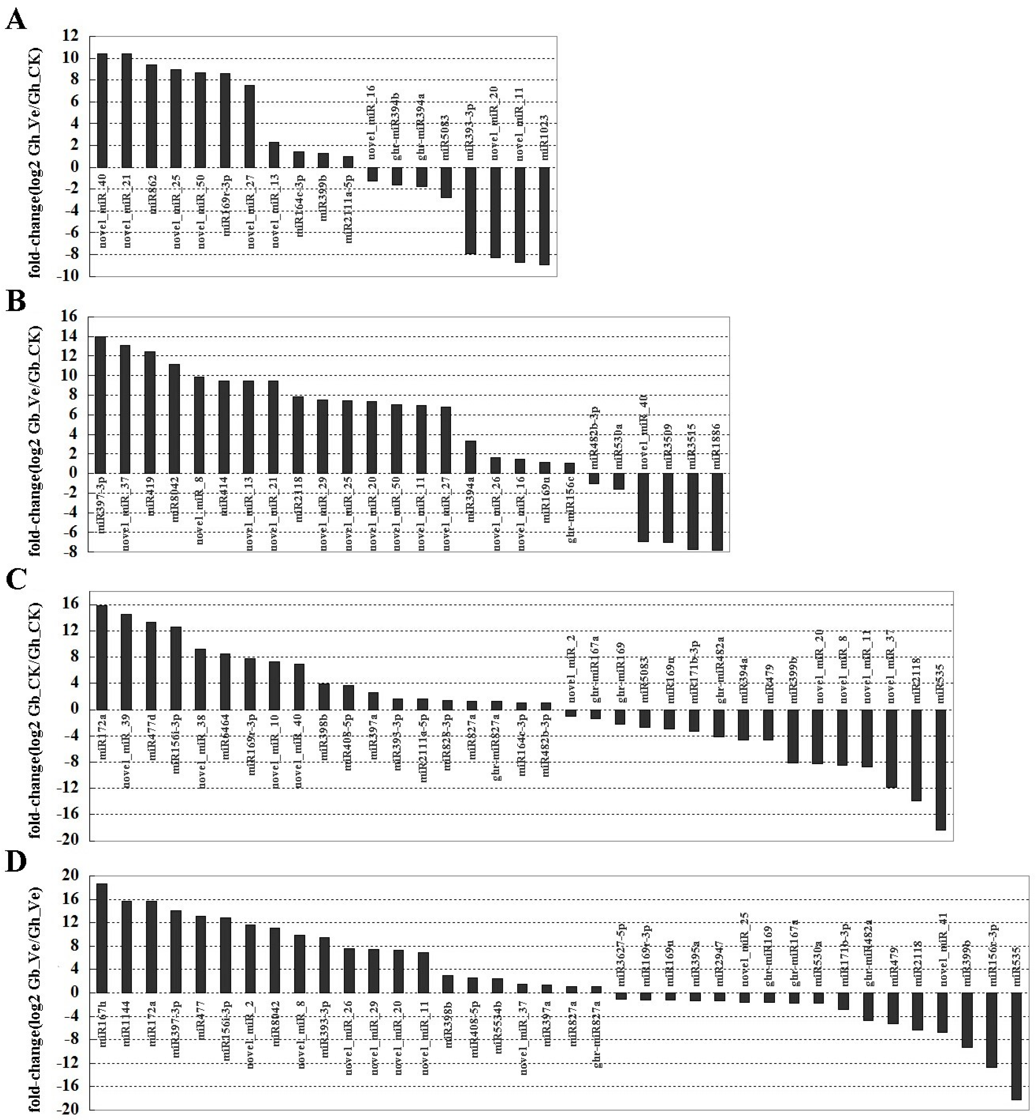 Expression profiles of differentially expressed miRNAs by high-throughput sequencing. (A) Differentially expressed miRNAs between Gh_Ve and Gh_CK libraries; (B) Differentially expressed miRNAs between Gb_Ve and Gb_CK libraries; (C) Differentially expressed miRNAs between Gb_CK and Gh_CK libraries; (D) Differentially expressed miRNAs between Gb_Ve and Gh_Ve libraries. Gh_CK: mock-inoculated G. hirsutum roots; Gh_Ve: Verticillium-inoculated G. hirsutum roots; Gb_CK: mock-inoculated G. barbadense roots; Gb_Ve: Verticillium-inoculated G. barbadense roots.