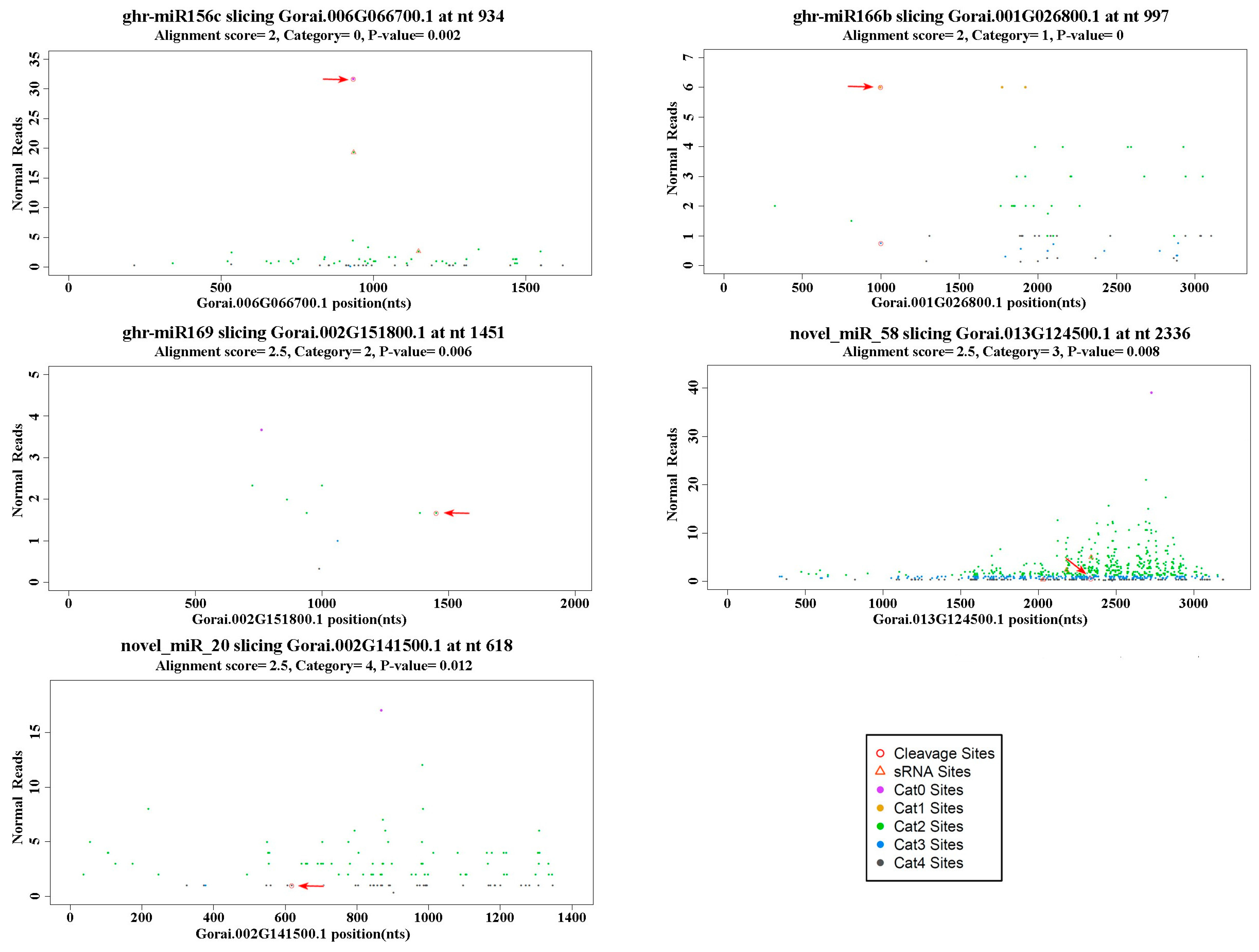 For the degradome sequencing data, 20–21 nt sequences of high quality were collected for subsequent analysis. The unique reads that perfectly matched cotton cDNA sequences were retained. The 15-nt of sequence upstream and downstream of the 5ʹ-end of matched reads was extracted to constitute 30-nt sequence tags for searching corresponding miRNA. The CleaveLand pipeline [27] was used to align the 30-nt sequence to cotton-known miRNAs from miRBase20.0 database and our newly identified miRNAs. All alignments with scores up to seven and no mismatches at the cleavage site (between nucleotides 10 and 11) were considered candidate targets.
