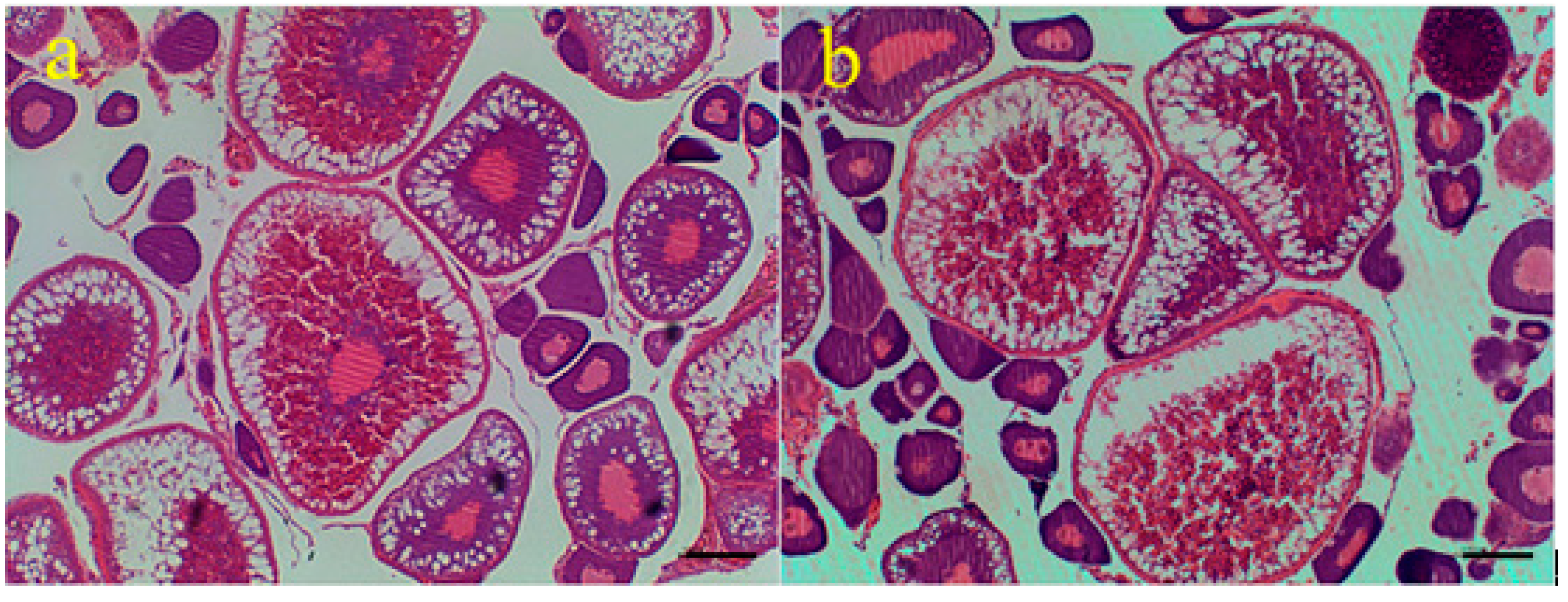 Microstructures of ovarian tissues of diploid (a) and tetraploid (b) loaches. Note: scale bars =100 µm.