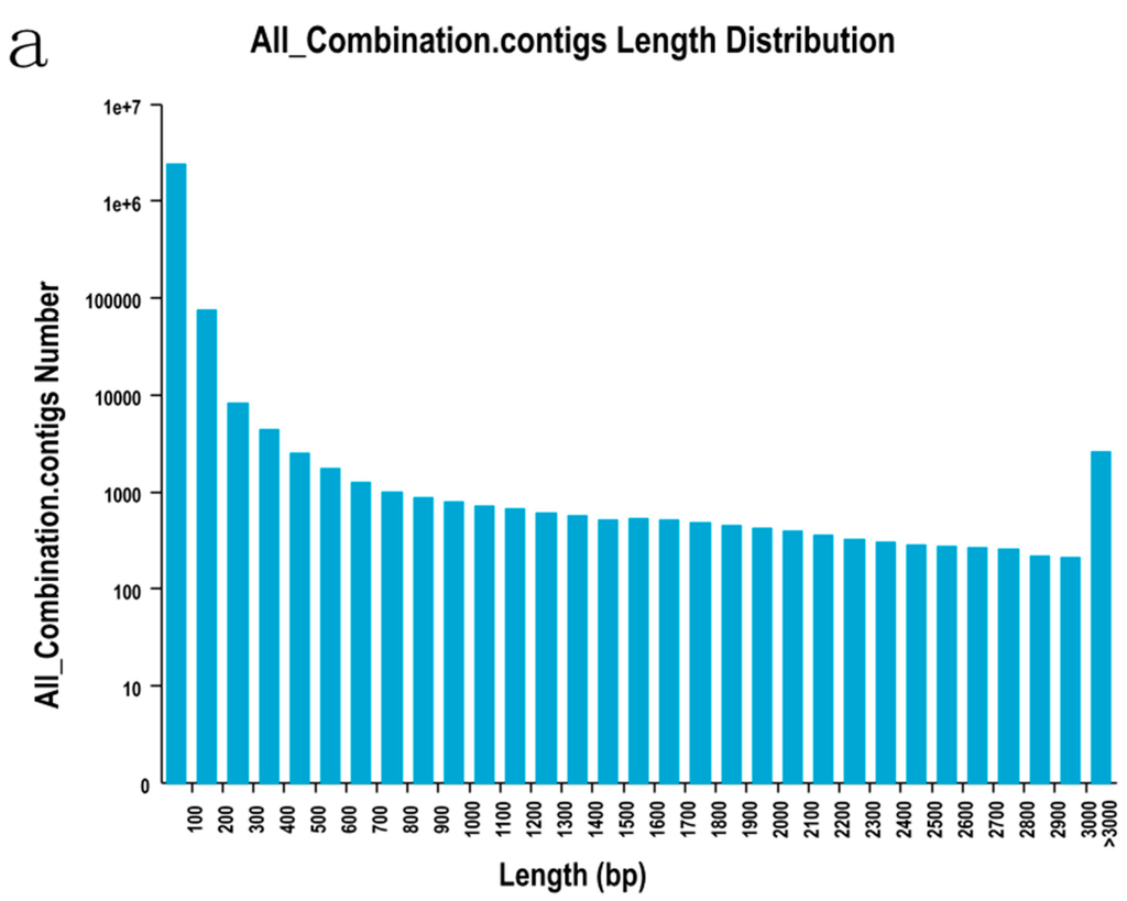 The size distributions of contigs (a), transcripts (b) and unigenes (c).
