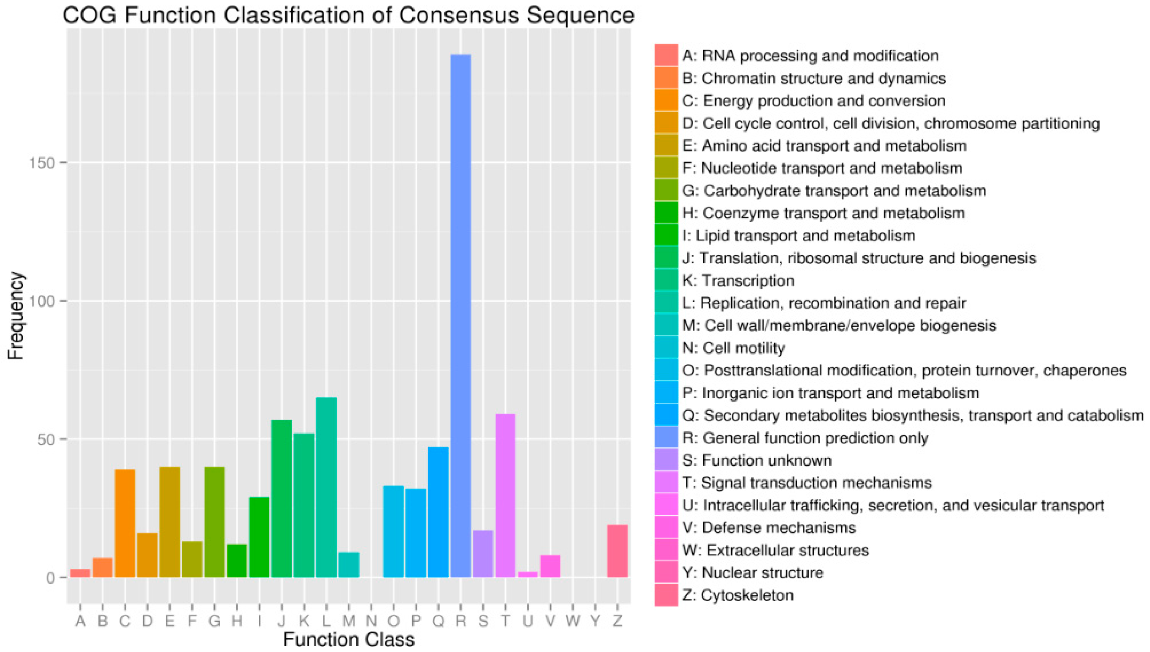 A total of 587 DEGs were assigned to the COG classifications (Figure 6). Among the 24 COG categories, the top 11 COG categories were as follows: general function prediction represented the largest group (189, 32.20%), followed by replication, recombination and repair (65, 11.07%), signal transduction mechanisms (59, 10.05%), translation, ribosomal structure and biogenesis (57, 9.71%), transcription (52, 8.86%), secondary metabolites biosynthesis, transport and catabolism (47, 8.01%), amino acid transport and metabolism (40, 6.81%), carbohydrate transport and metabolism (40, 6.81%), energy production and conversion (39, 6.64%), posttranslational modification, protein turnover, chaperones (33, 5.62%), inorganic ion transport and metabolism (32, 5.45%) and lipid transport and metabolism (29, 4.94%).
