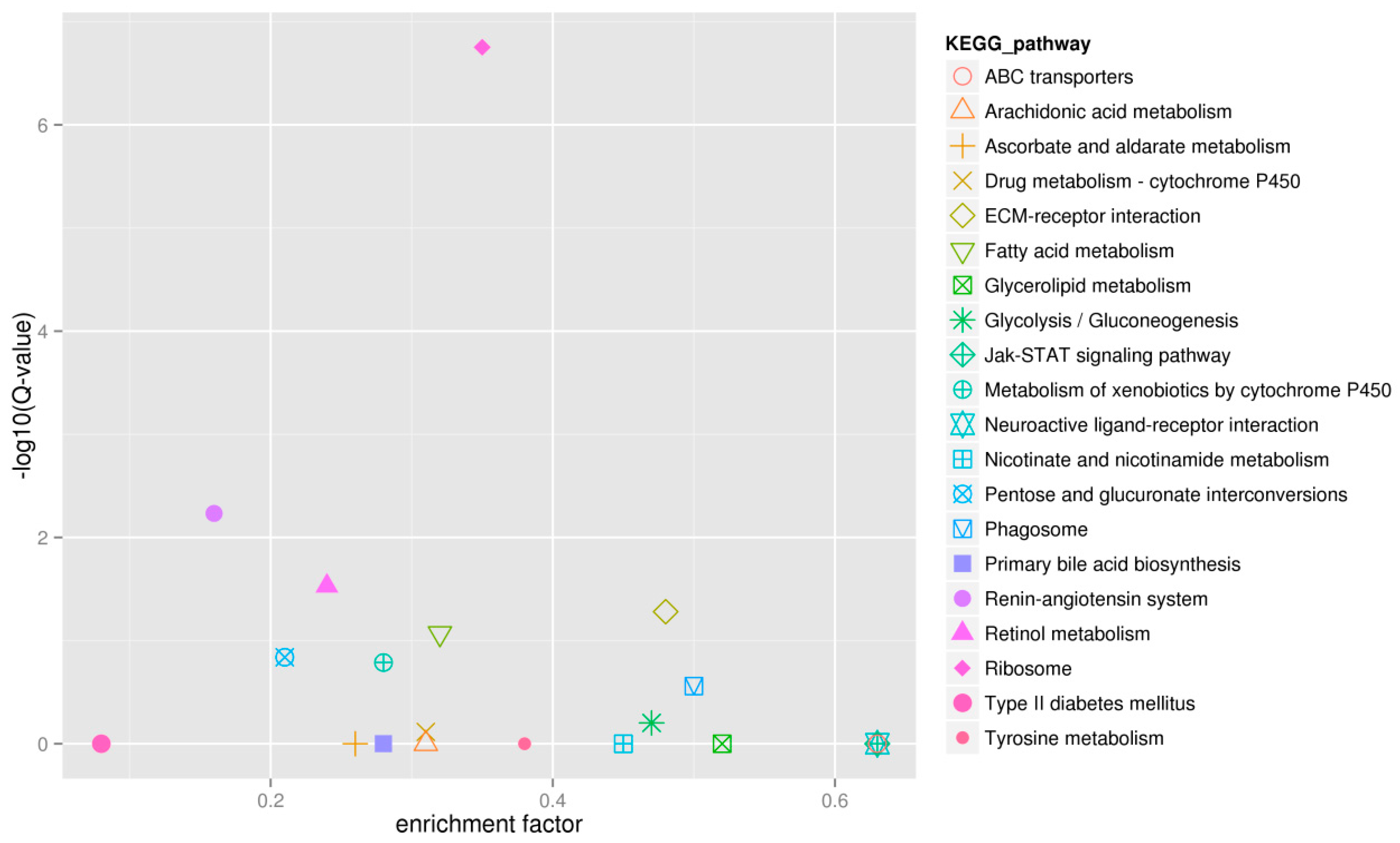 KEGG pathway annotation enabled us to assign 398 DEGs to 157 pathways. Pathway enrichment analysis identified the first ten enriched pathways including Ribosome (Ko03010), Renin-angiotensin system (Ko04614), Retinol metabolism (Ko00830), ECM-receptor interaction (Ko04512), Fatty acid metabolism (Ko00071), Pentose and glucuronate interconversions (Ko00040), Metabolism of xenobiotics by cytochrome P450 (Ko00980), Phagosome (Ko04145), Glycolysis/Gluconeogenesis (Ko00010) and Drug metabolism-cytochrome P450 (Ko00982). These enriched pathways had functions in cell proliferation, steroidogenesis activity, receptor binding, and energy metabolism, which might convey the differences of ovarian tissues developmental process between diploid and tetraploid loaches. The first twenty enriched pathways are shown in Figure 7.