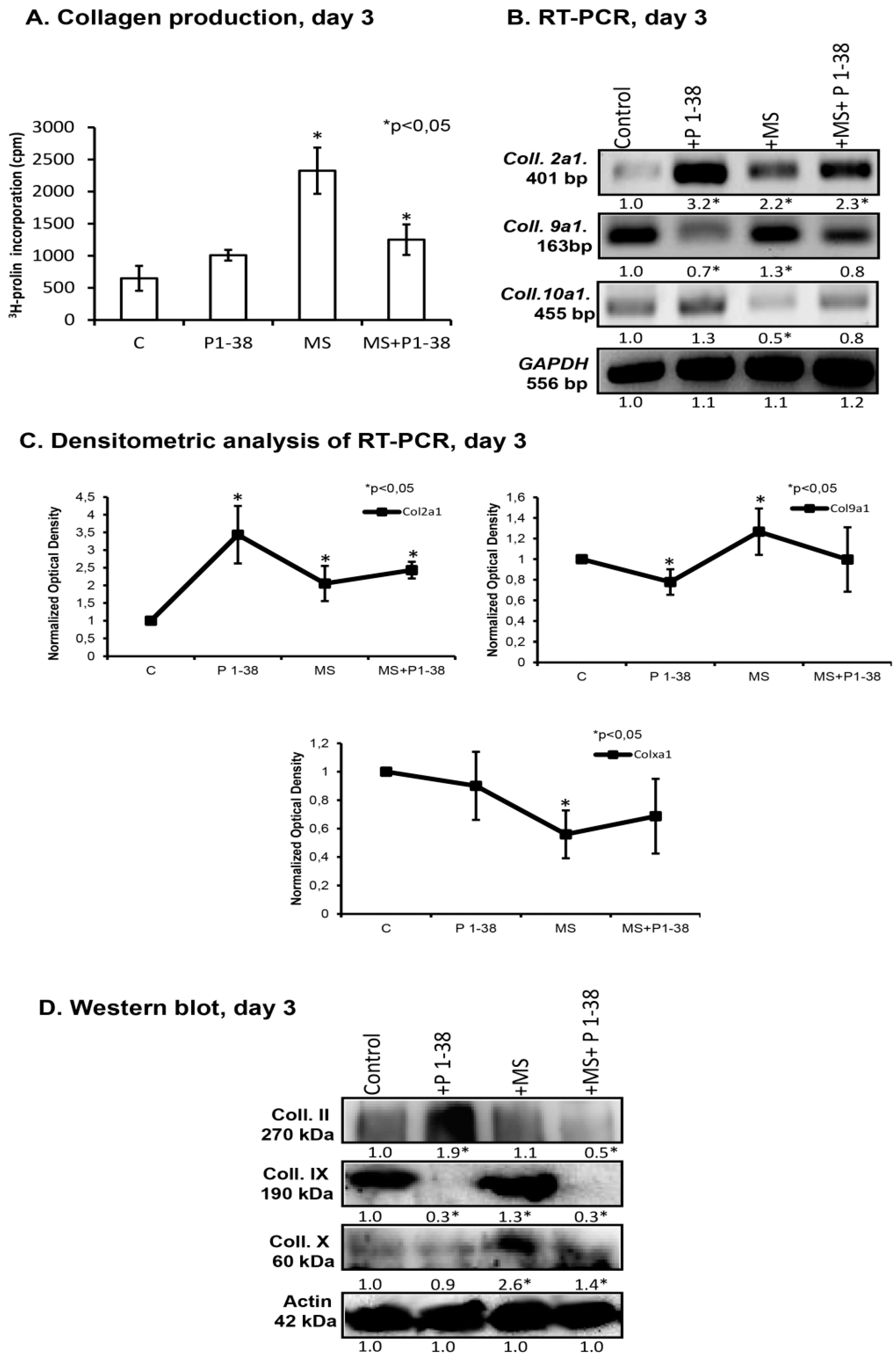 PACAP and/or mechanical load altered the collagen production of HDC. PACAP 1–38 at 100 nM was applied continuously from day one. Short time, transient MS, was applied on days two and three for 30 min on both days. (A) Collagen production of HDC was determined by 3H-collagen incorporation; (B) RNA expression of collagen type II (Col2a1), collagen type IX (Col9a1) and collagen type X (Col10a1) on day three. GAPDH was used as a control; (D) Protein expression of collagen type II, collagen type IX, collagen type X on day three. Actin was used as a control. For panels (B,D) numbers below signals represent integrated densities of signals determined by ImageJ software. Representative data of three independent experiments are shown; (C,E) Statistical analysis of RT-PCR and Western blot data. All data presented are the averages of at least three different experiments. Statistical analysis was performed by Student’s t-test. All data were normalized on GAPDH/Actin and data are expressed as mean ± SEM. (C, control; P1–38, PACAP 1–38; MS; mechanical stimulus). Statistically significant difference between collagen production rate of cells in cultures that received the loading regime and/or PACAP 1–38 vs. control cultures is marked by asterisk (* p < 0.05) in all panels.