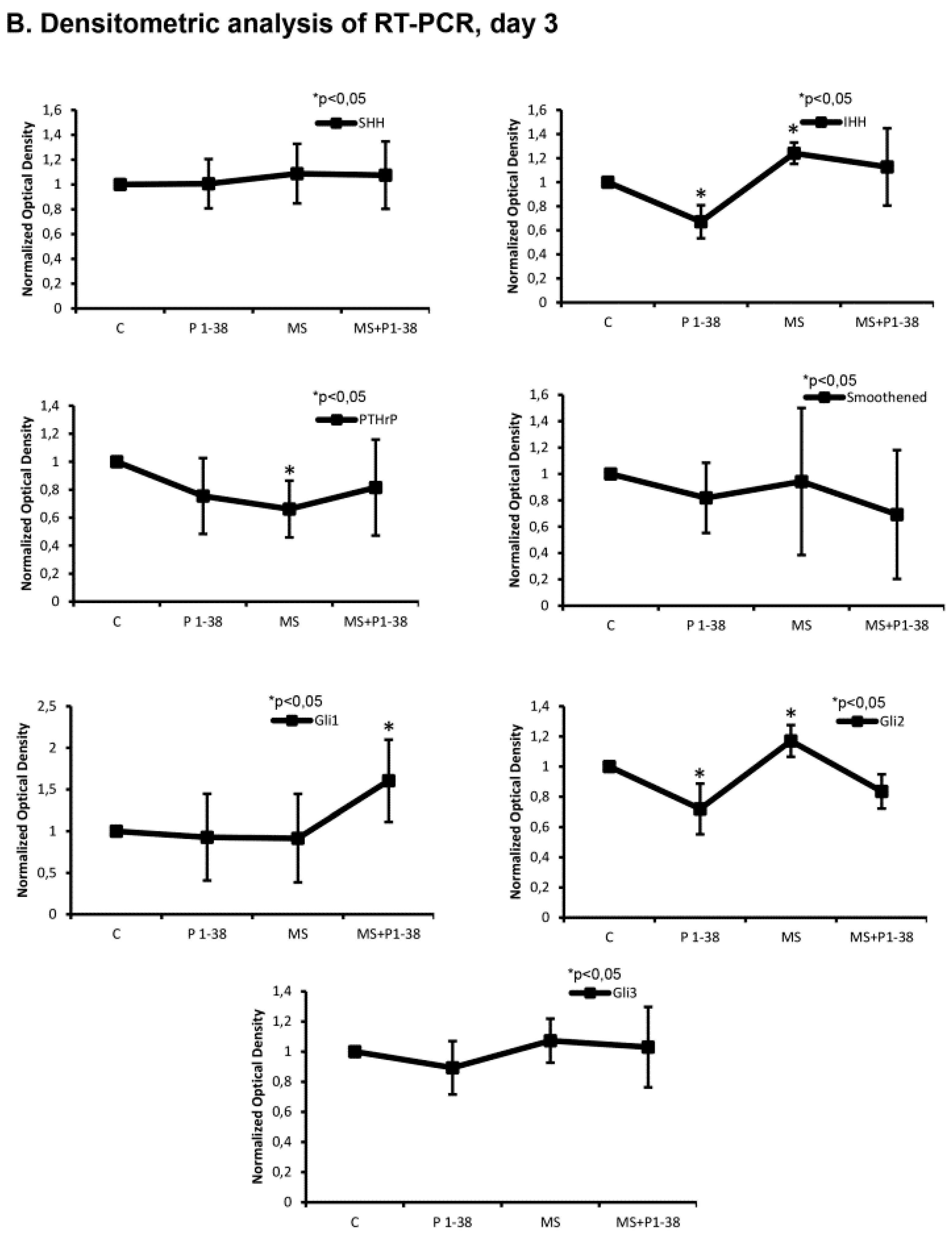 Effects of PACAP and/or mechanical stimulus on HH signaling of chondrofying cells. mRNA (A) and protein (C) expression of IHH, PTHrP, SHH, Smoothened (Smo), Gli1, Gli2 and Gli3 in HDC cultures on day three of culturing. For RT-PCR (A) reactions GAPDH and for Western blot (C) reactions Actin was used as control. Optical density of signals was measured and results were normalized to the optical density of controls. For panels (A,C) numbers below signals represent integrated densities of signals determined by ImageJ software. Representative results of three independent experiments are shown; (B,D) Statistical analysis of RT-PCR and Western blot data. All data are the average of at least three different experiments. Asterisks indicate significant (* p < 0.05) alteration of expression as compared to the respective control in all panels. Statistical analysis was performed by Student’s t-test. All data were normalized on GAPDH/Actin and data are expressed as mean ± SEM. (C, control; P1–38, PACAP 1–38; MS; mechanical stimulus).