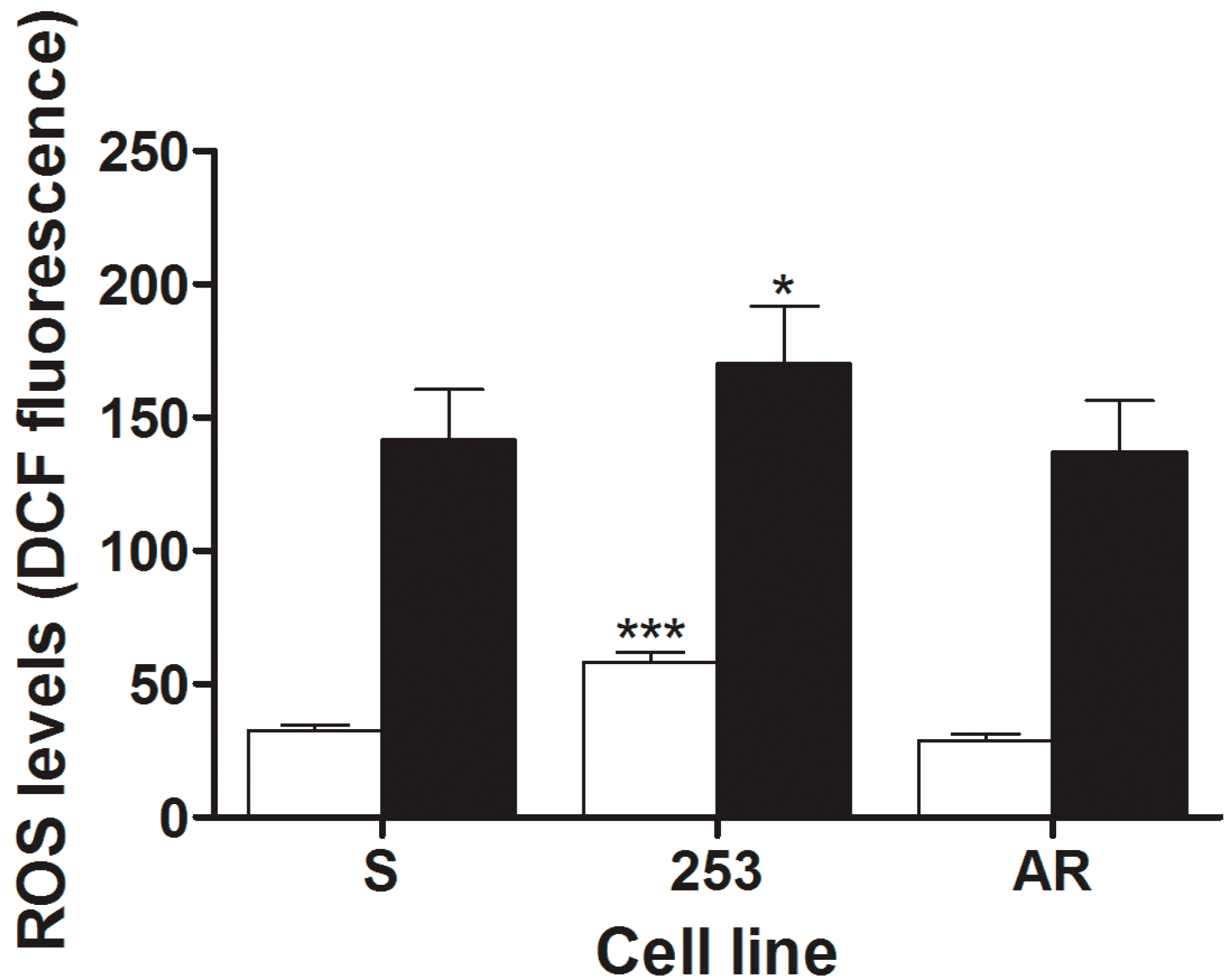 Endogenous ROS levels in 253 imatinib-resistant cells were higher than in their sensitive counterparts (p < 0.001) (Figure 2). UV radiation induced an evident increase in ROS level in all cell lines, but ROS production in 253 cells was still higher than in S line (p < 0.001). Therefore, primary imatinib-resistant cells accommodated more ROS than cells with acquired imatinib resistance, which might contribute to genome instability of these cells.