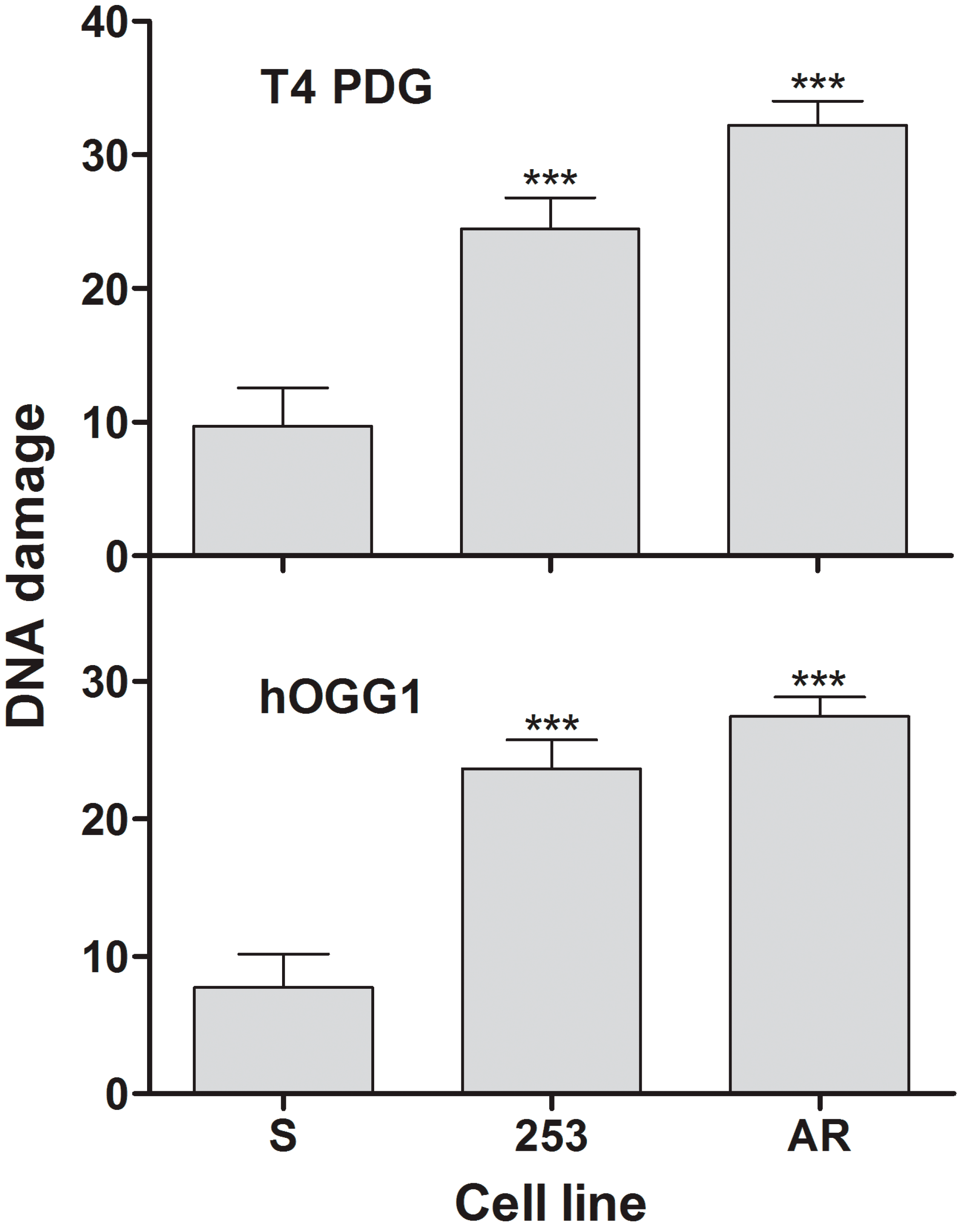 Mean DNA damage measured by percentage of DNA in tail of comets in alkaline version of comet assay modified by the use of T4 pyrimidine dimer glycosylase (T4 PDG) and human 8-oxoG glycosylase (hOGG1) in mouse 32D cells transfected with the BCR-ABL1 gene: sensitive (S) and resistant to imatinib exposed to UV radiation at 35 J/m2 at room temperature at a dose rate of 0.12 J/(m2·s). Imatinib resistance resulted from the Y253H mutation in BCR-ABL1 (253) or from incubation of S cells with escalating doses of imatinib (AR). Presented are means of three independent measurements, each for 100 cells; error bars represent SEM; *** p < 0.001 as compared with S line.
