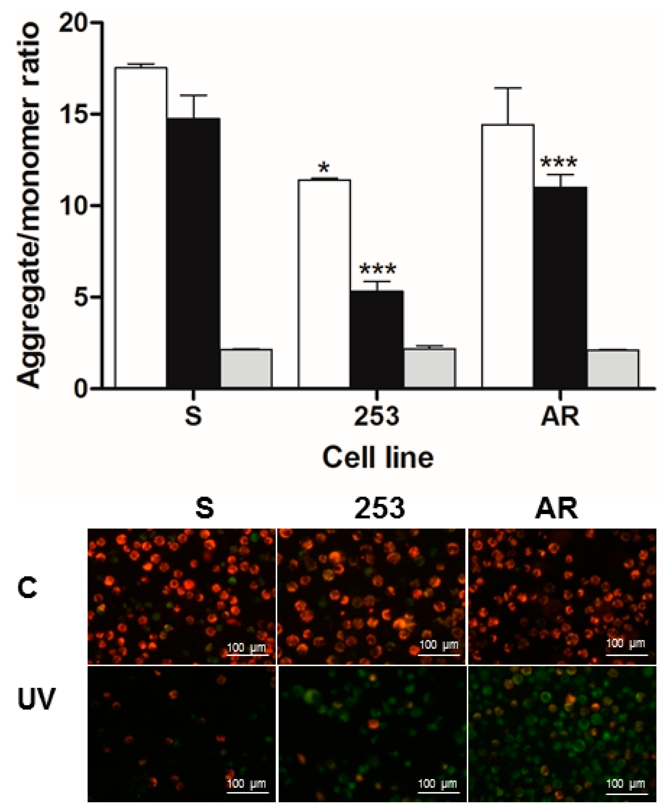 Mitochondrial membrane potential (MMP) in mouse 32D cells transfected with the BCR-ABL1 gene: sensitive (S) to imatinib or displaying imatinib resistance caused by the Y253H mutation in BCR-ABL1 (253) or incubation of the sensitive cells with increasing doses of the drug (AR). Upper panel. MMP is expressed as ratio of 530 nm/590 nm to 485 nm/538 nm (aggregates to monomer) fluorescence as quantified with a fluorescent plate reader after JC-1 staining. Cells were irradiated with UV light at 35 J/m2 at room temperature at a dose rate of 0.12 J/(m2·s) (UV, black bars) and compared to control, non-irradiated cells (C, white bars). The mitochondrial uncoupler CCCP (carbonyl cyanide 3 chlorophenylhydrazone) was used as a positive control (grey bars). Fluorescence was measured after a 24 h incubation. Values are means ± SD (n = 4). * p < 0.05 and *** p < 0.001 as compared with imatinib-sensitive cells, respectively; Lower panel. Fluorescence microscopy (400×) of control cells (C) and cells treated with UV light (UV). Mitochondria in C cells are polarized and JC-1 accumulates in mitochondria as aggregate with red fluorescence, while in apoptotic cells JC-1 remains in cytoplasm in monomeric form emitting green fluorescence.