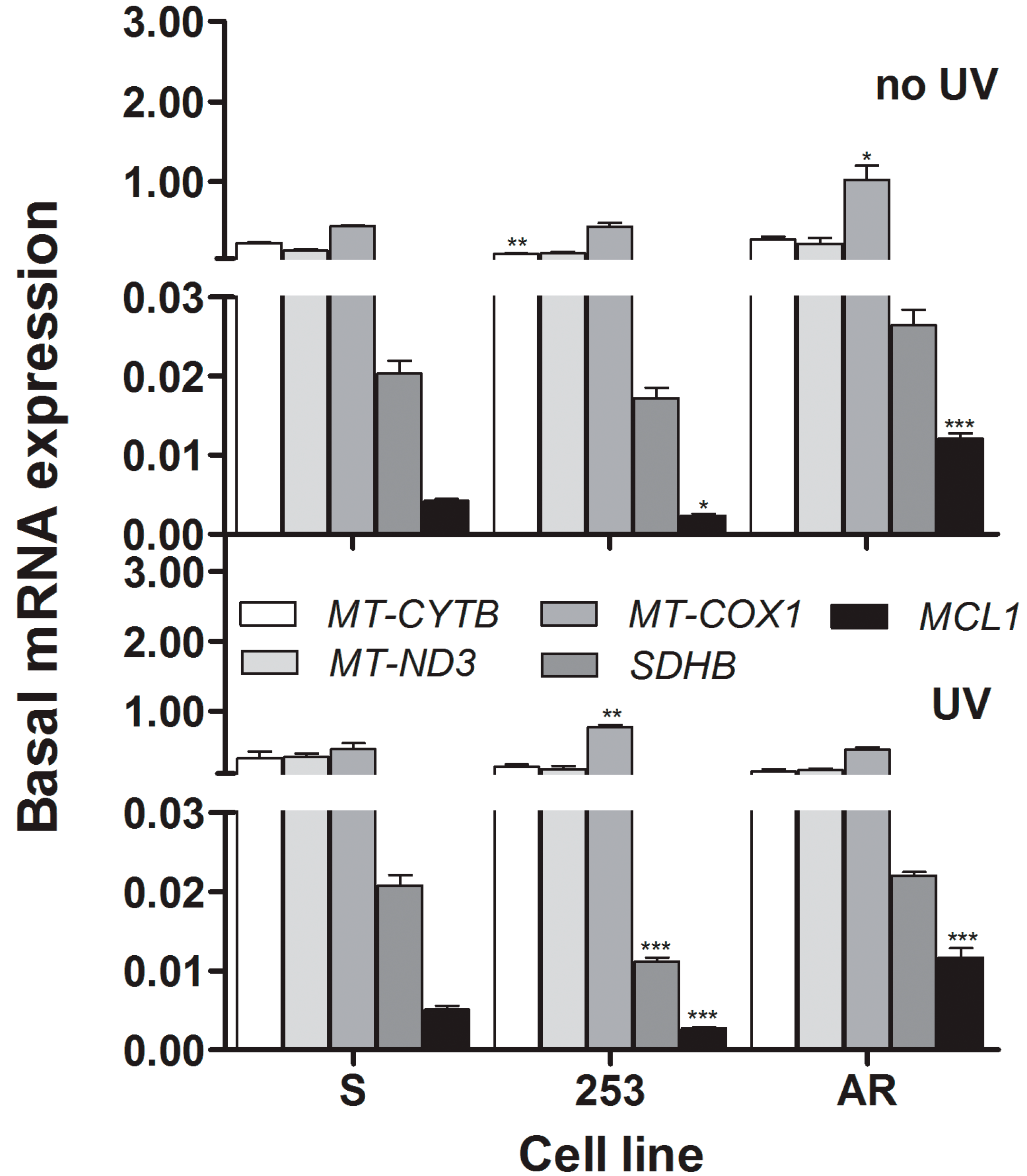 Basal mRNA expression of the nuclear SDHB (succinate dehydrogenase complex, subunit B), Mcl-1 (myeloid cell leukemia sequence 1) and mitochondrial COX1 (cytochrome c oxidase subunit I) gene in non-irradiated (upper panel) or UV-irradiated (lower panel) mouse 32D cells transfected with the BCR-ABL1 gene sensitive to imatinib (S) or cells displaying imatinib resistance caused by the Y253H mutation in BCR-ABL1 (253) or incubation of the sensitive cells with increasing doses of imatinib (AR). Cells were irradiated with UV light at 35 J/m2 at room temperature at a dose rate of 0.12 J/(m2·s) and the expression was determined by TaqMan probe-based real-time PCR (RT-PCR) assay and calculated by the 2−ΔCt method and ΔCt was obtained by subtracting Ct of ACTB mRNA from Ct of mRNA of respective nuclear gene or Ct of RNR2 from Ct of COX1. Data are shown as means ± SEM (n = 3), * p < 0.005, ** p < 0.01, *** p < 0.001 as compared with imatinib-sensitive cells.