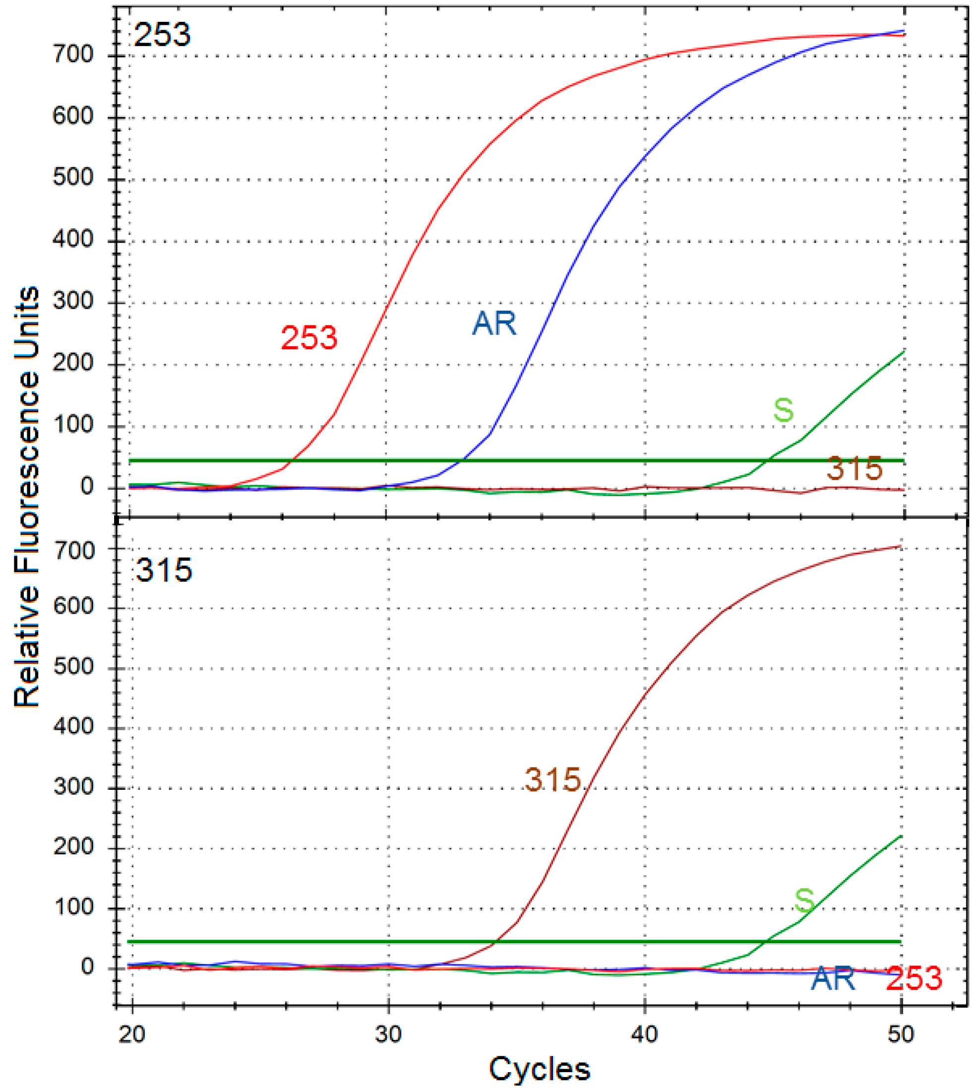 Results of a representative mutational analysis of BCR-ABL1-expressing cells: sensitive to imatinib (S) and primarily resistant to imatinib due to the Y253H with acquired resistance to imatinib. The analysis was based on an allele-specific RT-PCR with primers specific to cDNA obtained by reverse transcription of mRNA produced from the gene of active BCR-ABL1 kinase. The upper plot shows amplification with primers specific for the Y253H mutation, the lower shows those for the T315I mutation. Cell line harboring the T315I mutation (315) and cultured in the same conditions as 253 was used as a positive control.