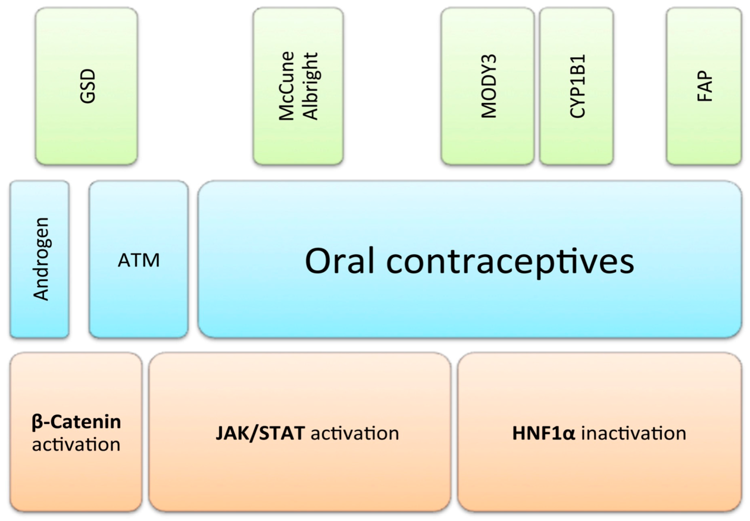 Risk factors of hepatocellular adenomas (HCA). Various genetically-defined predisposing factors are depicted in green. Blue bars represent environmental factors frequently associated with the development of HCA, second to none the use of oral contraceptives in females. Orange boxes in the lowermost line represent three distinguishable molecular pathways, which define the main subgroups of HCA. GSD: glycogenosis; FAP: familiar adenomatous polyposis; ATM: alcohol, tobacco, metabolic syndrome; JAK: Janus kinase; STAT: signal transducer and activator of transcription; HNF1α: hepatocytic nuclear factor 1 α.
