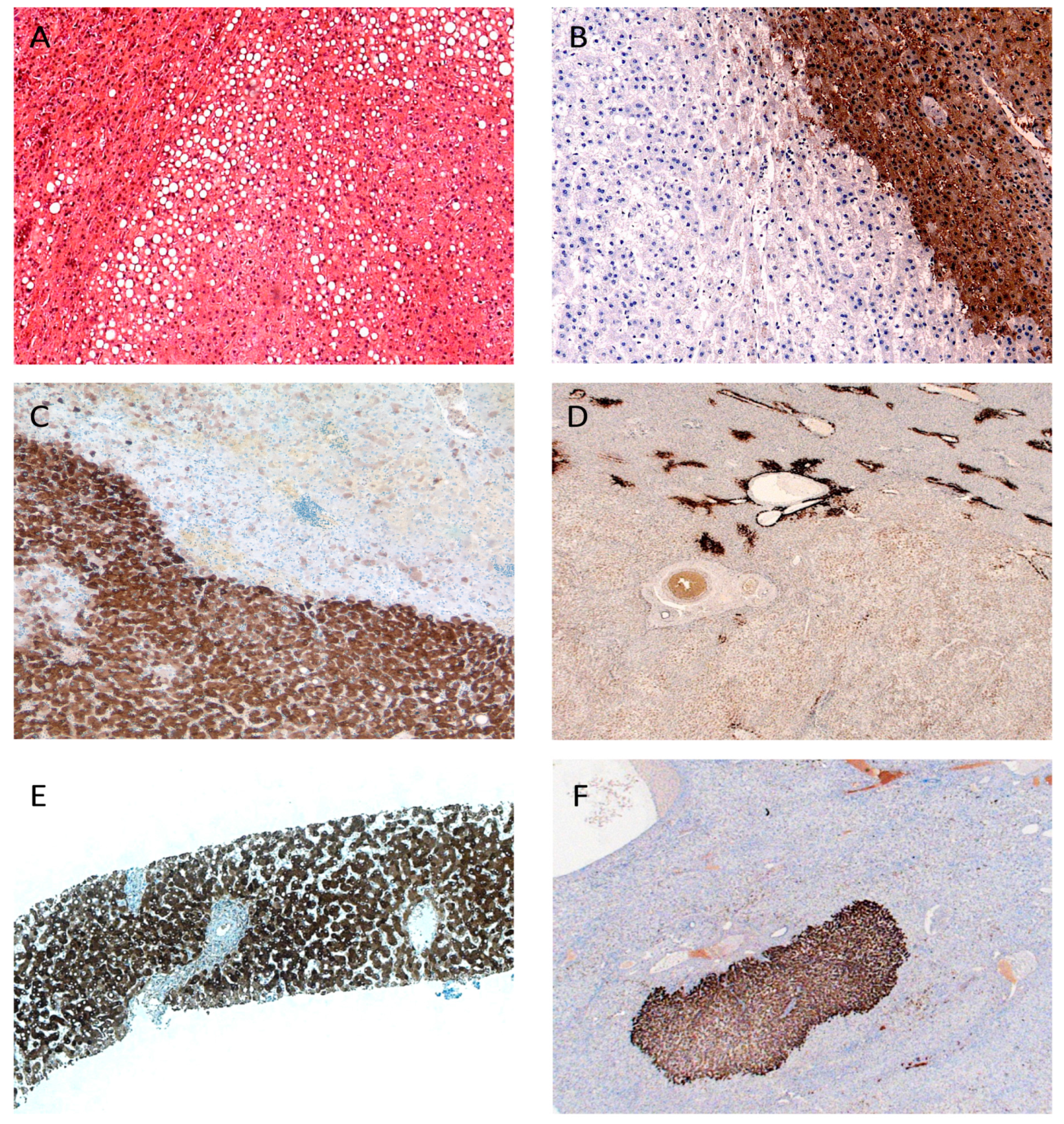 - Lagana, S.M.; Salomao, M.; Bao, F.; Moreira, R.K.; Lefkowitch, J.H.; Remotti, H.E. Utility of an immunohistochemical panel consisting of glypican-3, heat-shock protein-70, and glutamine synthetase in the distinction of low-grade hepatocellular carcinoma from hepatocellular adenoma. Appl. Immunohistochem. Mol. Morphol. 2013, 21, 170–176. [Google Scholar] [CrossRef] [PubMed]