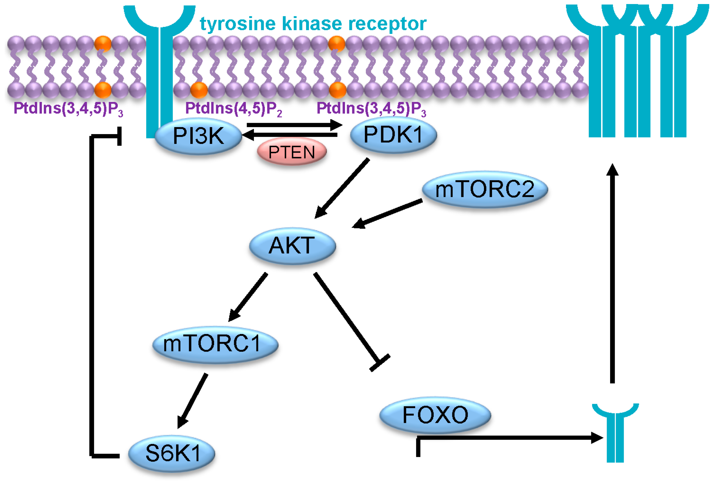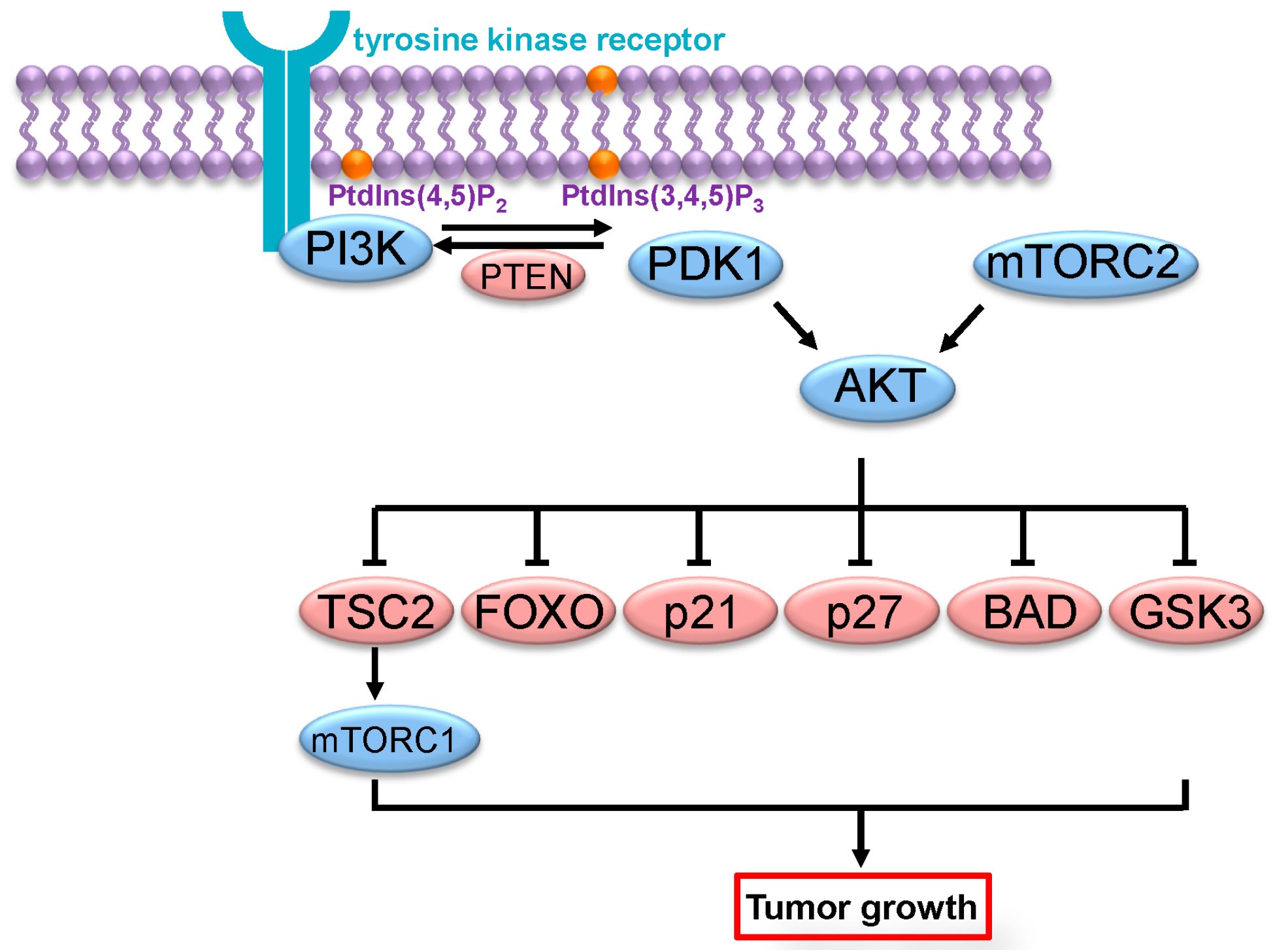 PI3K/AKT signaling pathway. Following its activation by tyrosine kinase receptors, PI3K catalyzes the phosphorylation of PtdIns(4,5)P2 (phosphatidylinositol 4,5-bisphosphate) to PtdIns(3,4,5)P3 (phosphatidylinositol 3,4,5-trisphosphate), resulting in the recruitment of PDK1 and AKT to the plasma membrane and their activation. AKT then acts upon multiple downstream effectors, leading to cell growth, proliferation and survival.