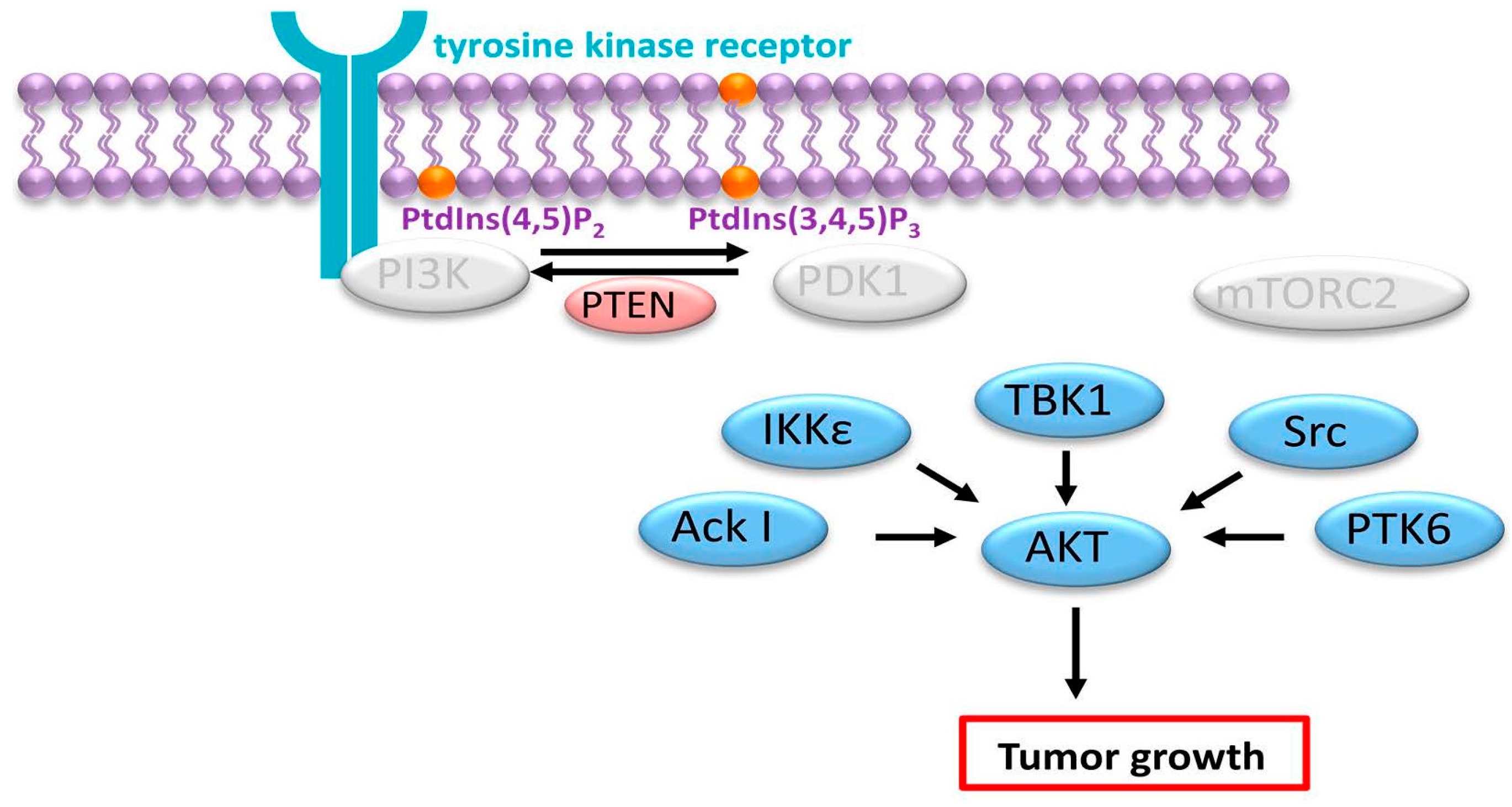 PI3K-independent AKT activation in cancer. Several kinases including Ack I, IKKε, TBK1, Src, PTK6 (protein tyrosine kinase 6) can activate AKT independently of PDK1 and mTORC2. Light gray ovals imply components of the signaling pathway that are not activated or bypassed.