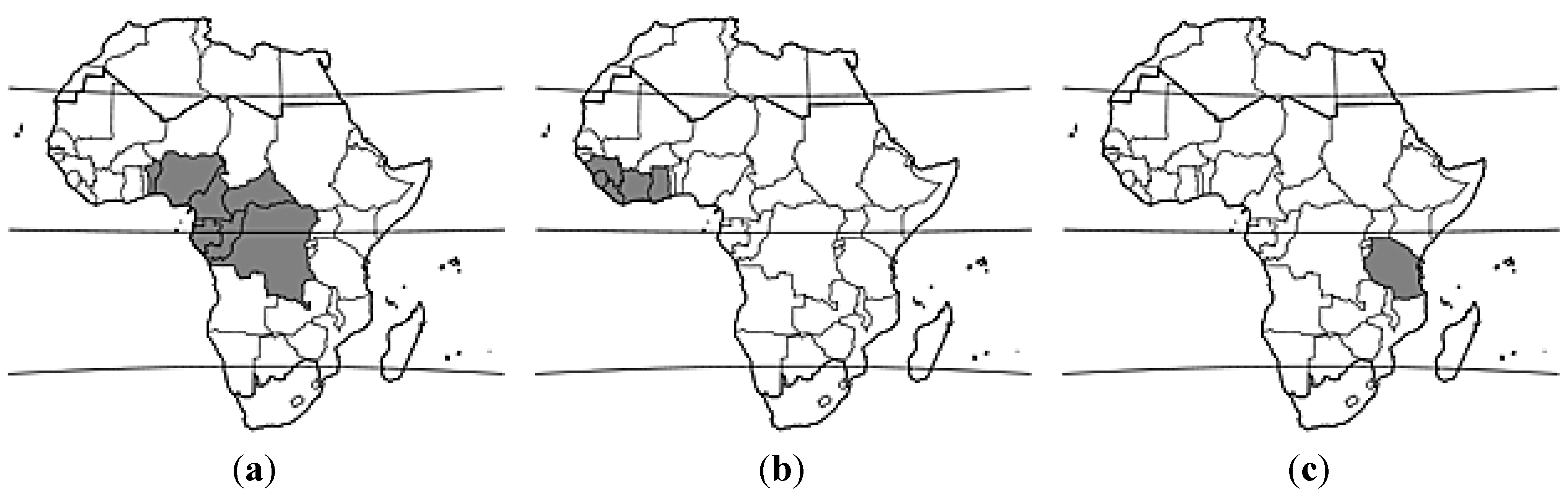 Native geographic distributions of (a) Allanblackia floribunda; (b) A. parviflora; and (c) A. stuhlmannii. Maps reprinted with permission from: PROTA (Plant Resources of Tropical Africa/Ressources végétales de l’Afrique tropicale), Wageningen, The Netherlands. http://www.prota4u.org.