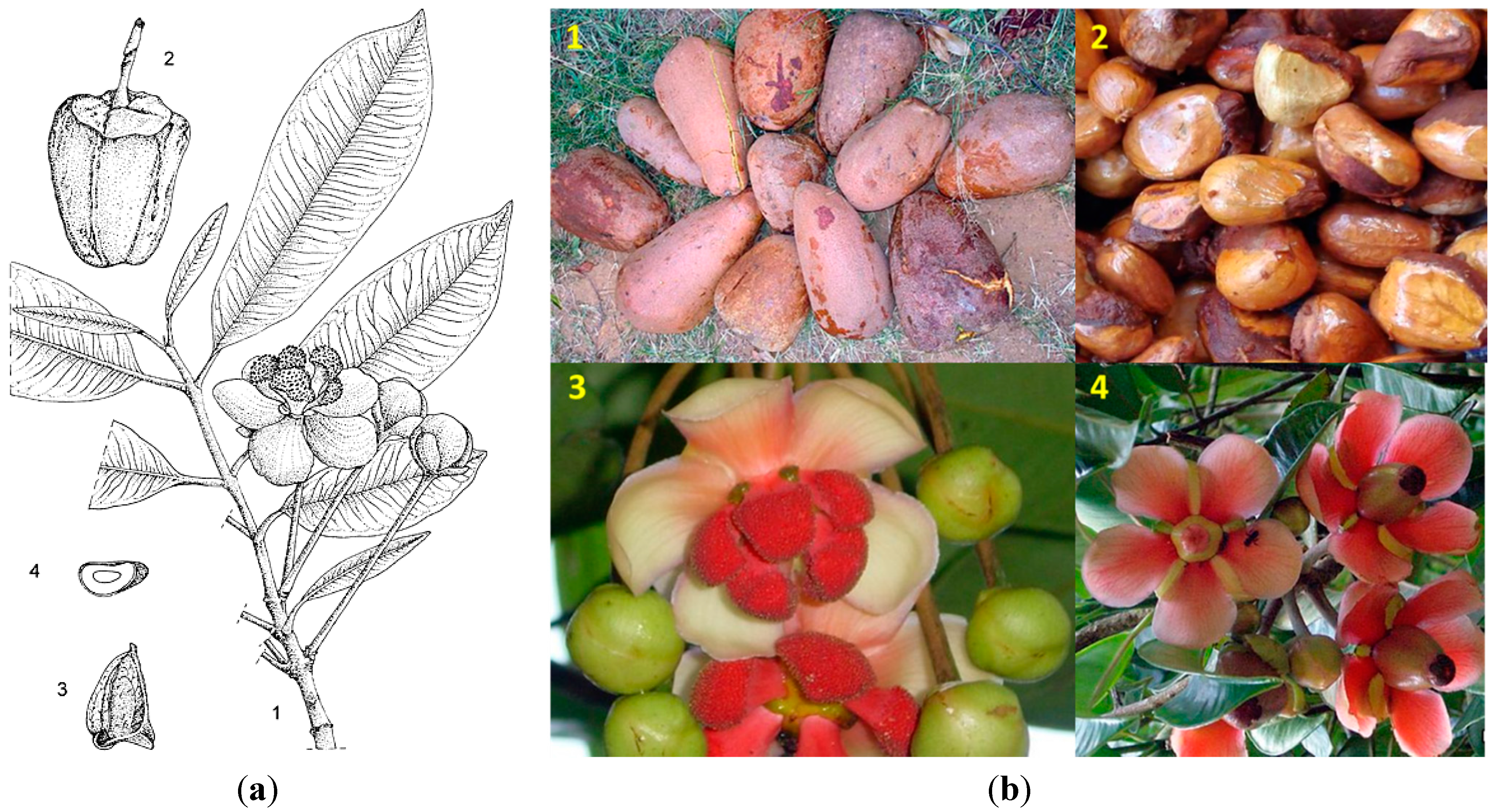 | Seeds | Ovoid, 2.5–3 cm × 1.5–2 cm, enclosed in a pinkish aril; embryo small, embedded in oily endosperm | Ovoid, ca. 3 cm × 2 cm, enclosed in a pinkish aril | 4-Angular, ca. 4 cm × 2–3 cm, one angle with a small fleshy aril; embryo small, embedded in oily endosperm |