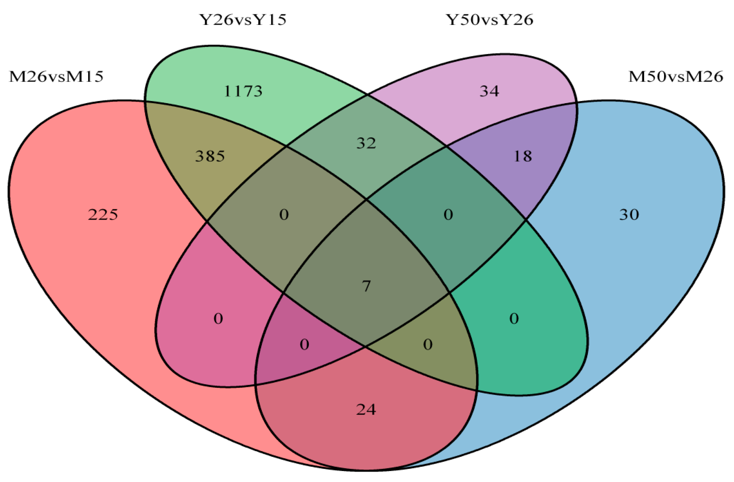 Venn diagram illustration of endometrial genes changed between days 15 and 26 of gestation and days 26 and 50 of gestation in Meishan and Yorkshire pigs. M15, Meishan pigs on day 15 of gestation. M26, Meishan pigs on day 26 of gestation. M50, Meishan pigs on day 50 of gestation. Y15, Yorkshire pigs on day 15 of gestation. Y26, Yorkshire pigs on day 26 of gestation. Y50, Yorkshire pigs on day 50 of gestation. DEGs as defined by FDR < 0.05 and FC ≥ 2.