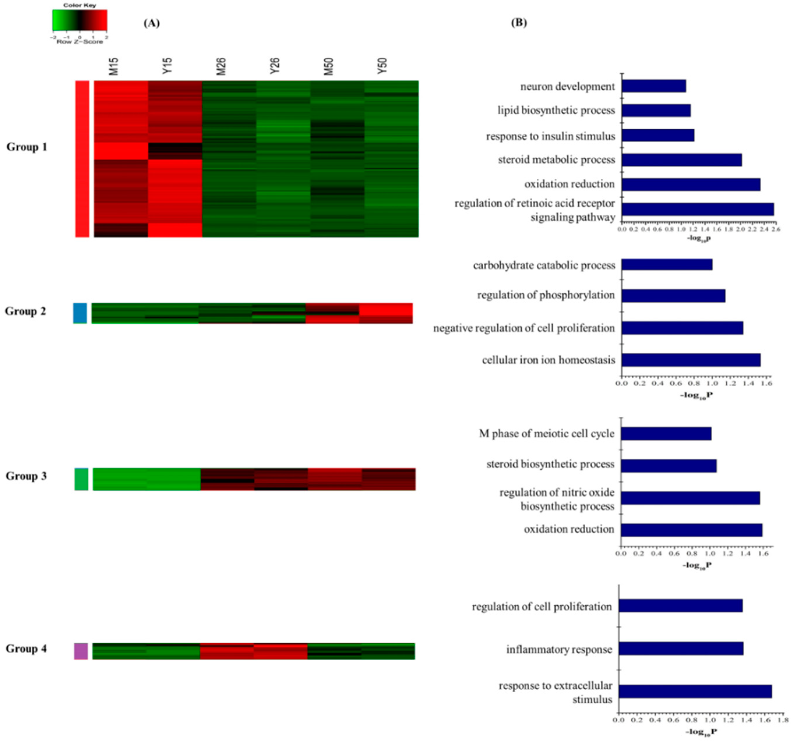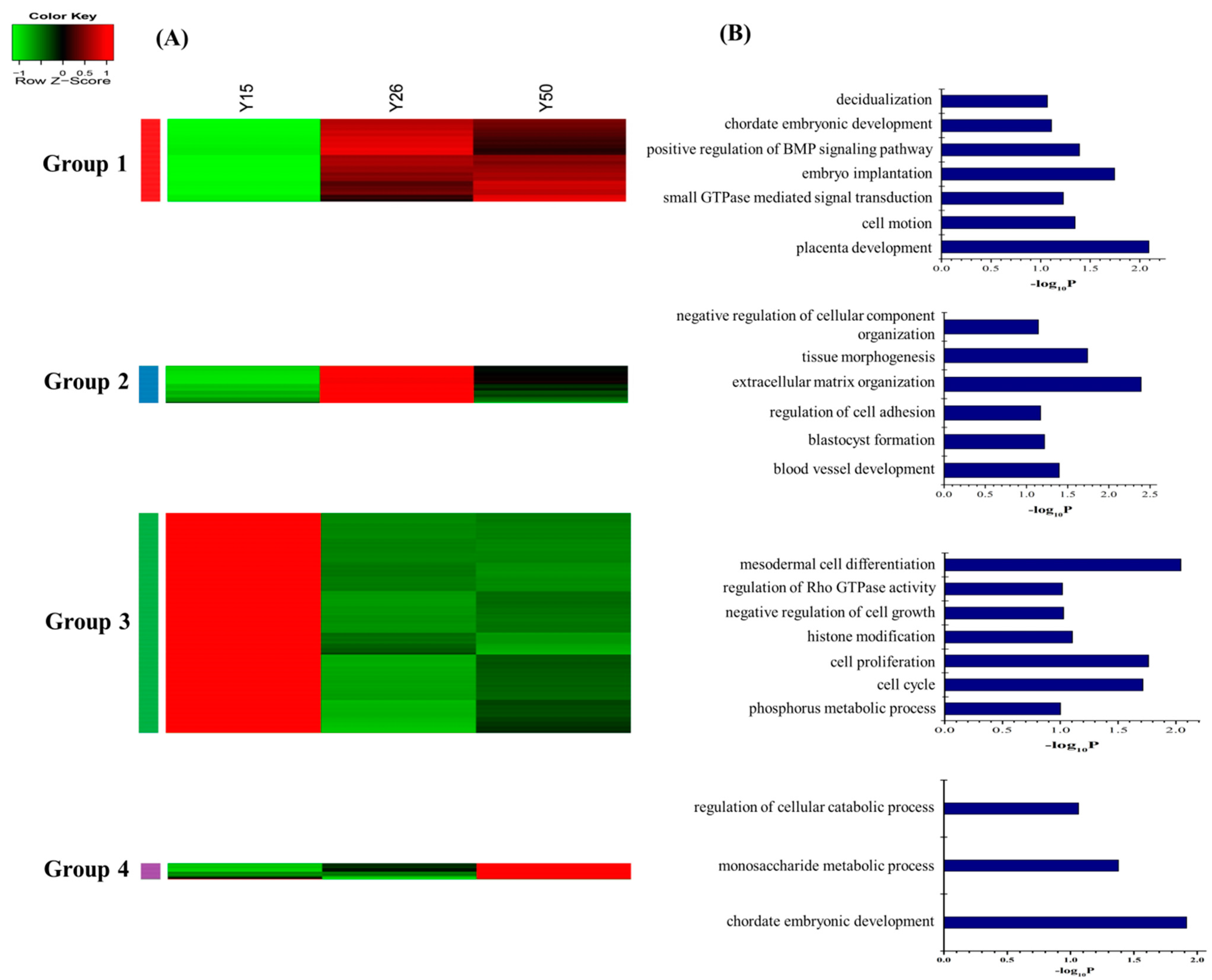 Dynamic progression of the unique DEGs in Yorkshire endometrium. (A) Unsupervised hierarchical clustering of 536 differentially expressed genes unique to Yorkshire endometrium. DEGs were clustered into four groups. Red region, genes up-regulated in the endometrium; green region, genes down-regulated in the endometrium. Y15, Yorkshire pigs on day 15 of gestation; Y26, Yorkshire pigs on day 26 of gestation; Y50, Yorkshire pigs on day 50 of gestation; (B) Functional categories distribution of unique DEGs in the Yorkshire endometrium.