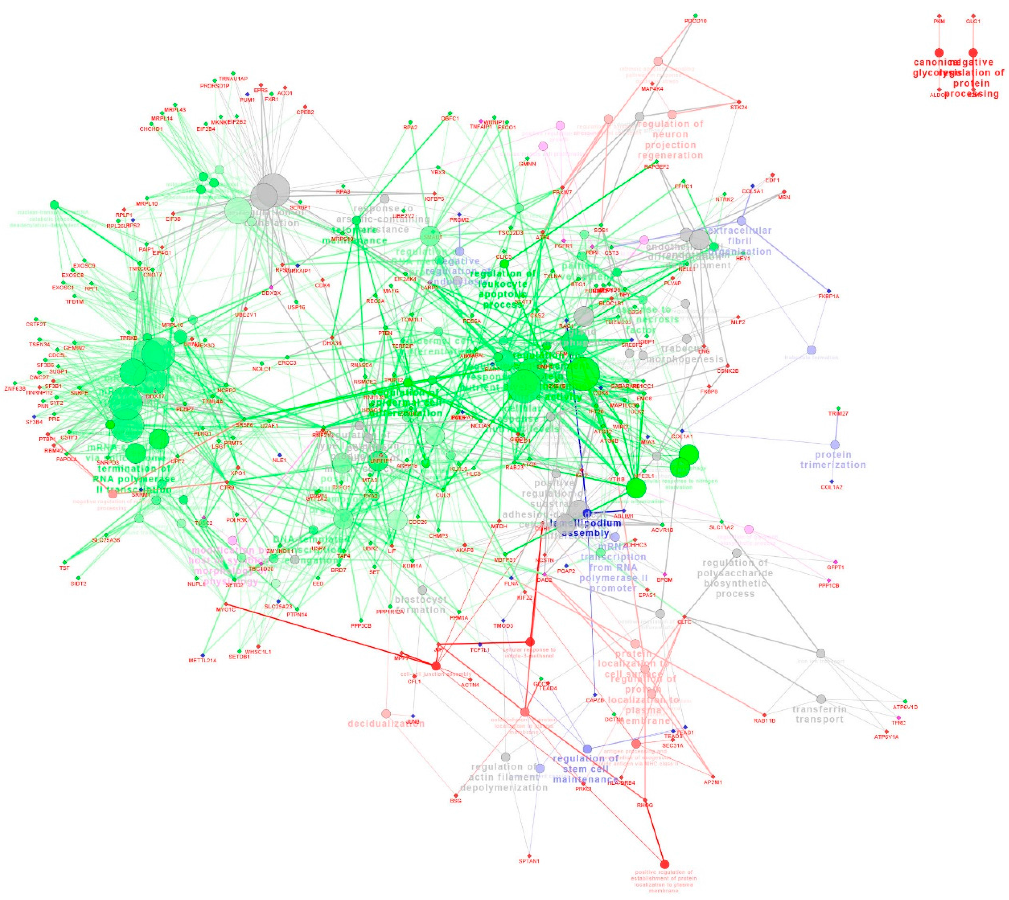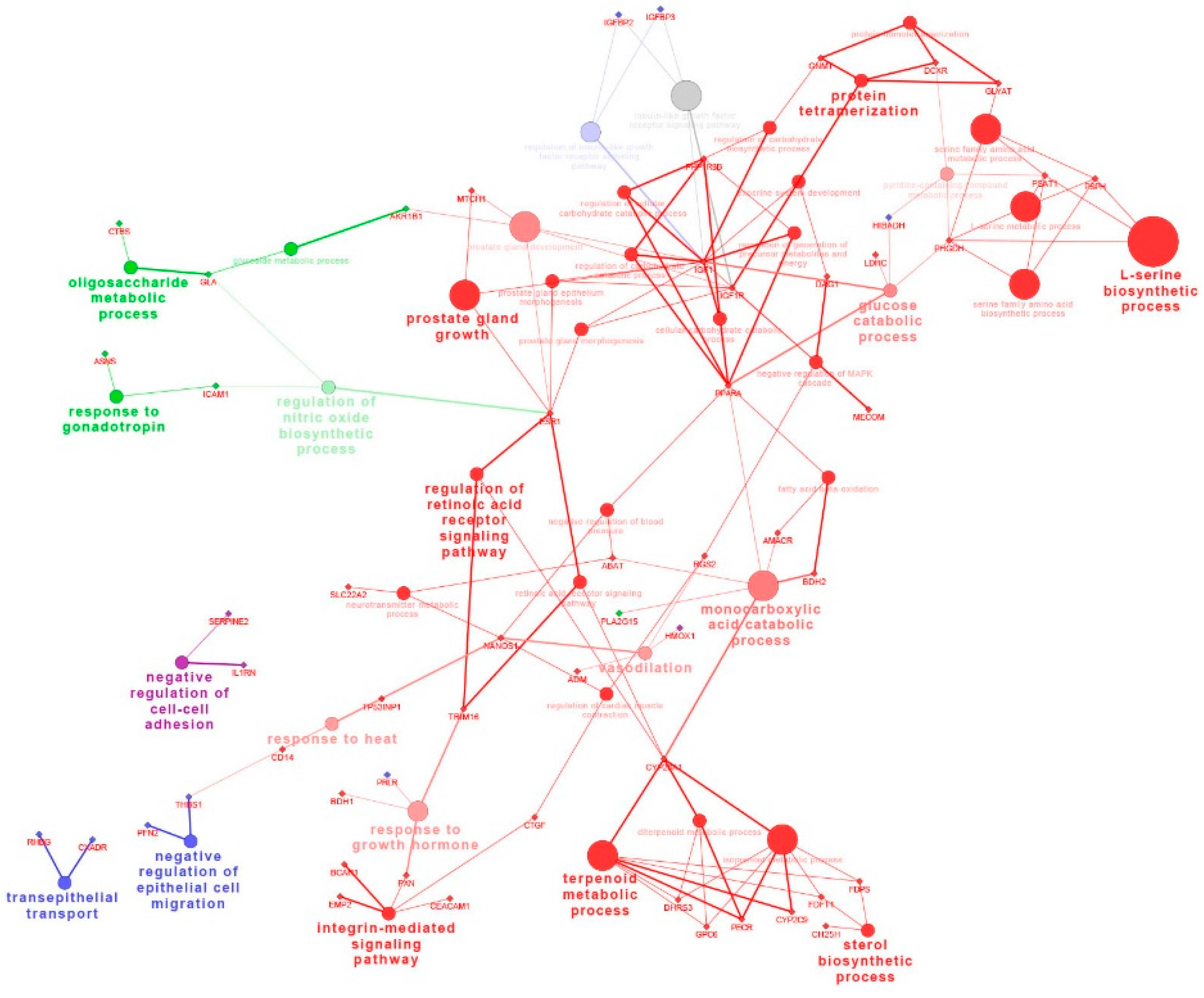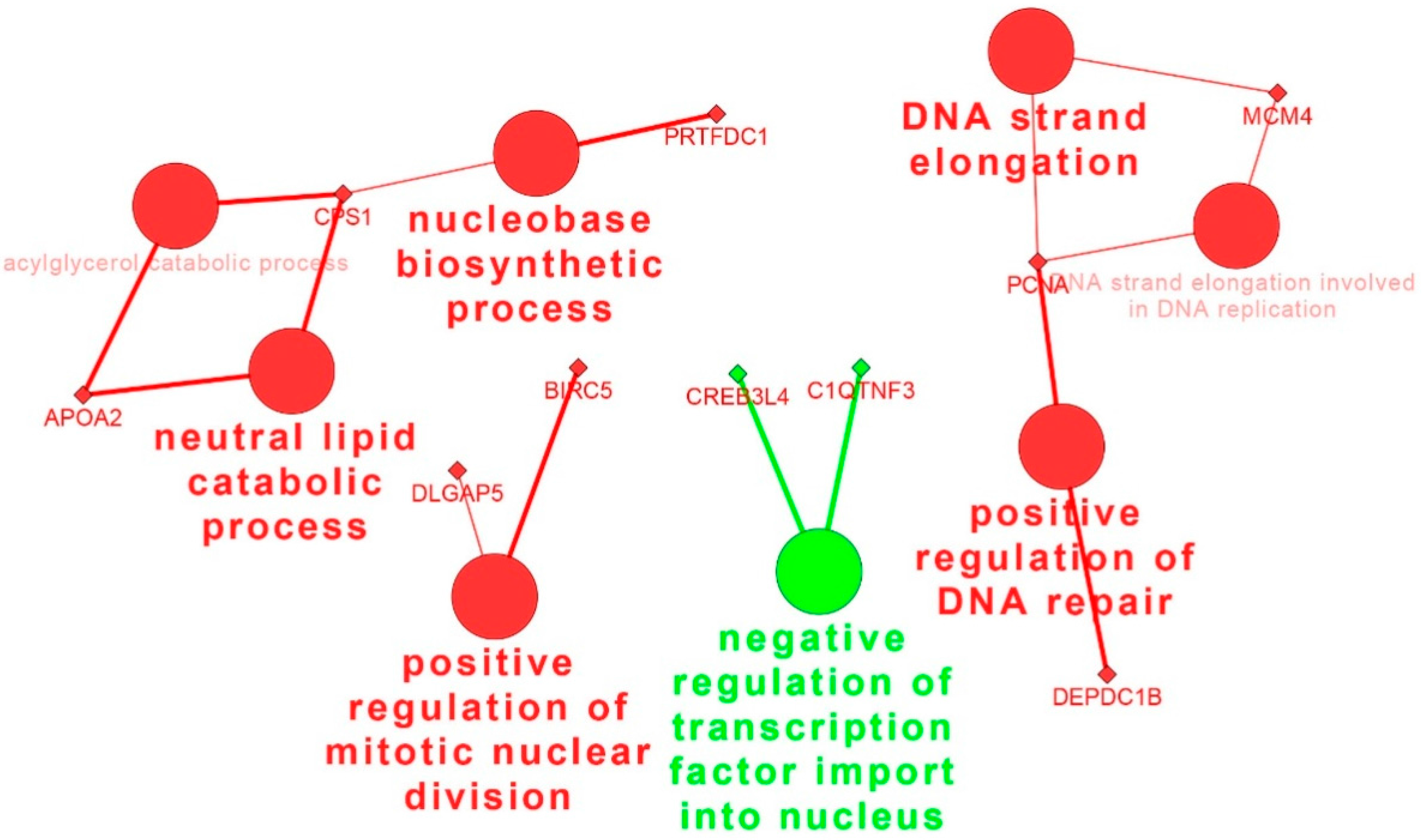 The network of the DEGs unique to Meishan endometrium on gestational days 15, 26 and 50. The genes are represented as diamond. Biological processes are represented as circles. The lines represent the potential connections between different genes belonging to different biological process. Red nodes represent genes up-regulated on gestational day 26. Green nodes represent genes highly expressed on gestational day 15.