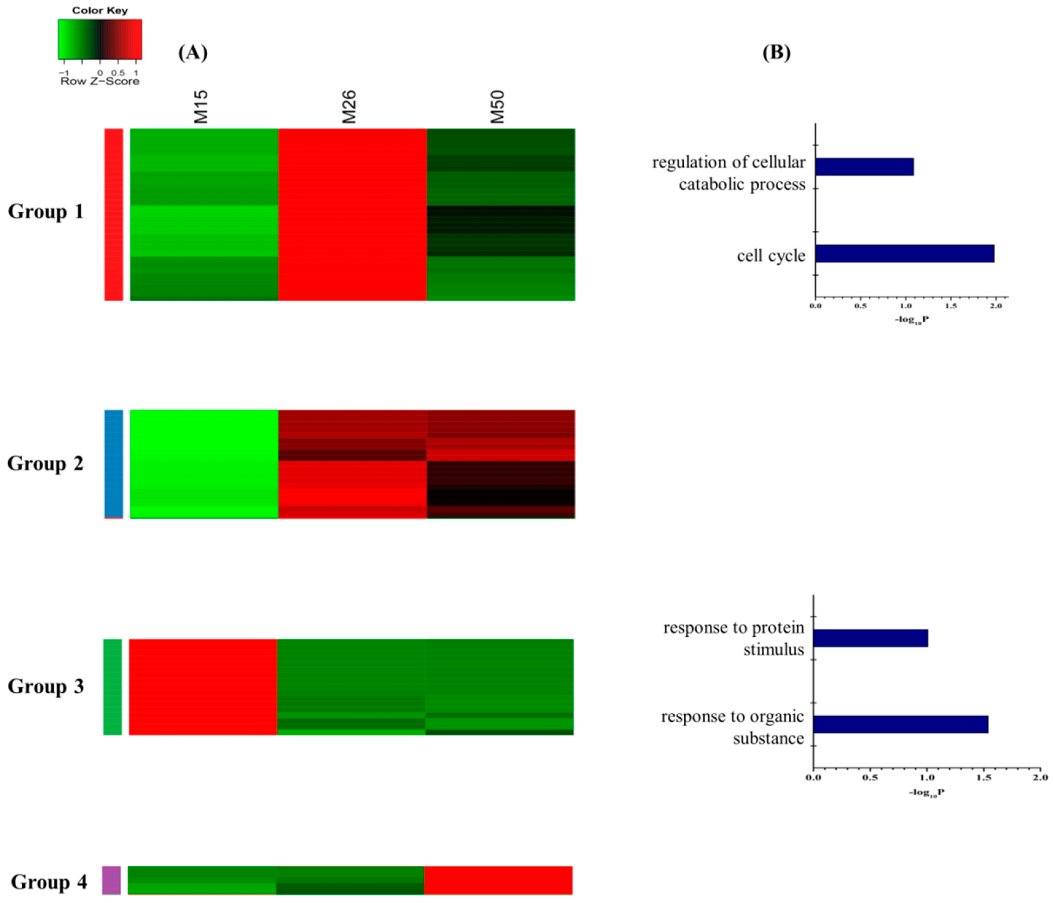 Dynamic of unique DEGs in Meishan endometriums. (A) Unsupervised hierarchical clustering of the 73 DEGs unique to Meishan endometrium. DEGs were clustered into four groups. Red region, genes up-regulated in the endometrium, green region, genes down-regulated in the endometrium. M15, Meishan pigs on day 15 of gestation; M26, Meishan pigs on day 26 of gestation; M50, Meishan pigs on day 50 of gestation; (B) Functional categories distribution of the unique DEGs in the Meishan endometrium.