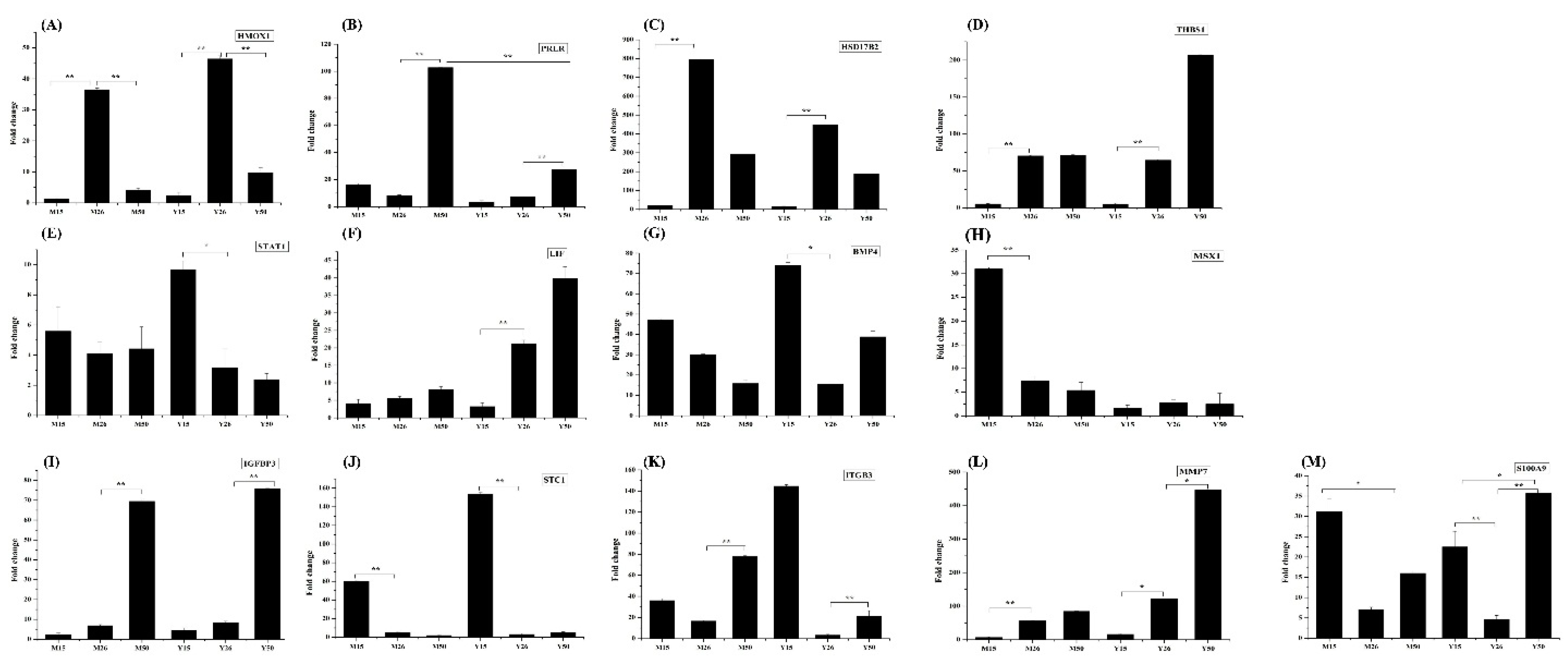 Validation of the expression levels of 13 representative genes by quantitative RT-PCR. The x-axis represents the different stages and breeds and the y-axis shows the fold changes in expression (** p < 0.01, * p < 0.05). (A) HMOX1 gene; (B) PRLR gene; (C) HSD17B2 gene; (D) THBS1 gene; (E) STAT1 gene; (F) LIF gene; (G) BMP4 gene; (H) MSX1 gene; (I) IGFBP3 gene; (J) STC1 gene; (K) ITGB3 gene; (L) MMP7 gene; (M) S100A9 gene.