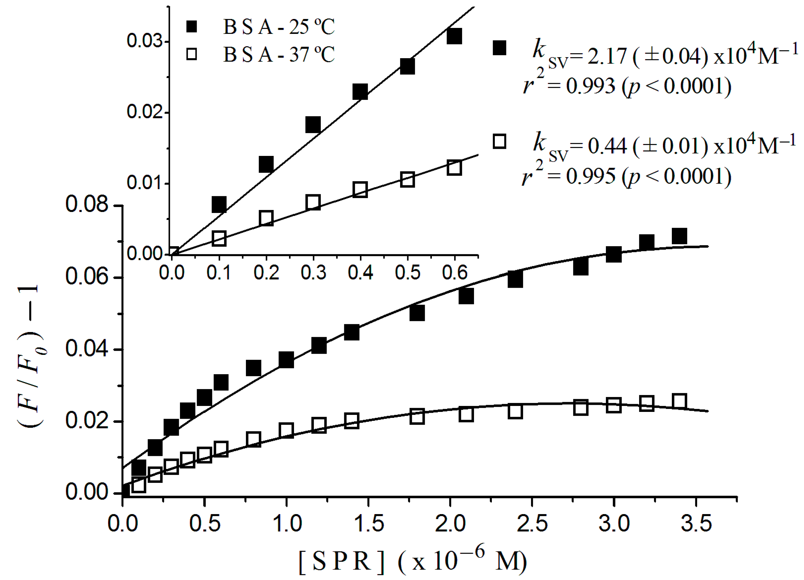Stern-Volmer plots of BSA titrated with sulpiride at 25 and 37 °C. Excitation λ = 290 nm; (albumin) = 2 × 10−6 M; 10−3 M phosphate buffer, pH 7.4, [SPR] = sulpiride concentration. Detail shows plot region for low sulpiride concentration region, with regression coefficient and Stern-Volmer constant estimated for this region.