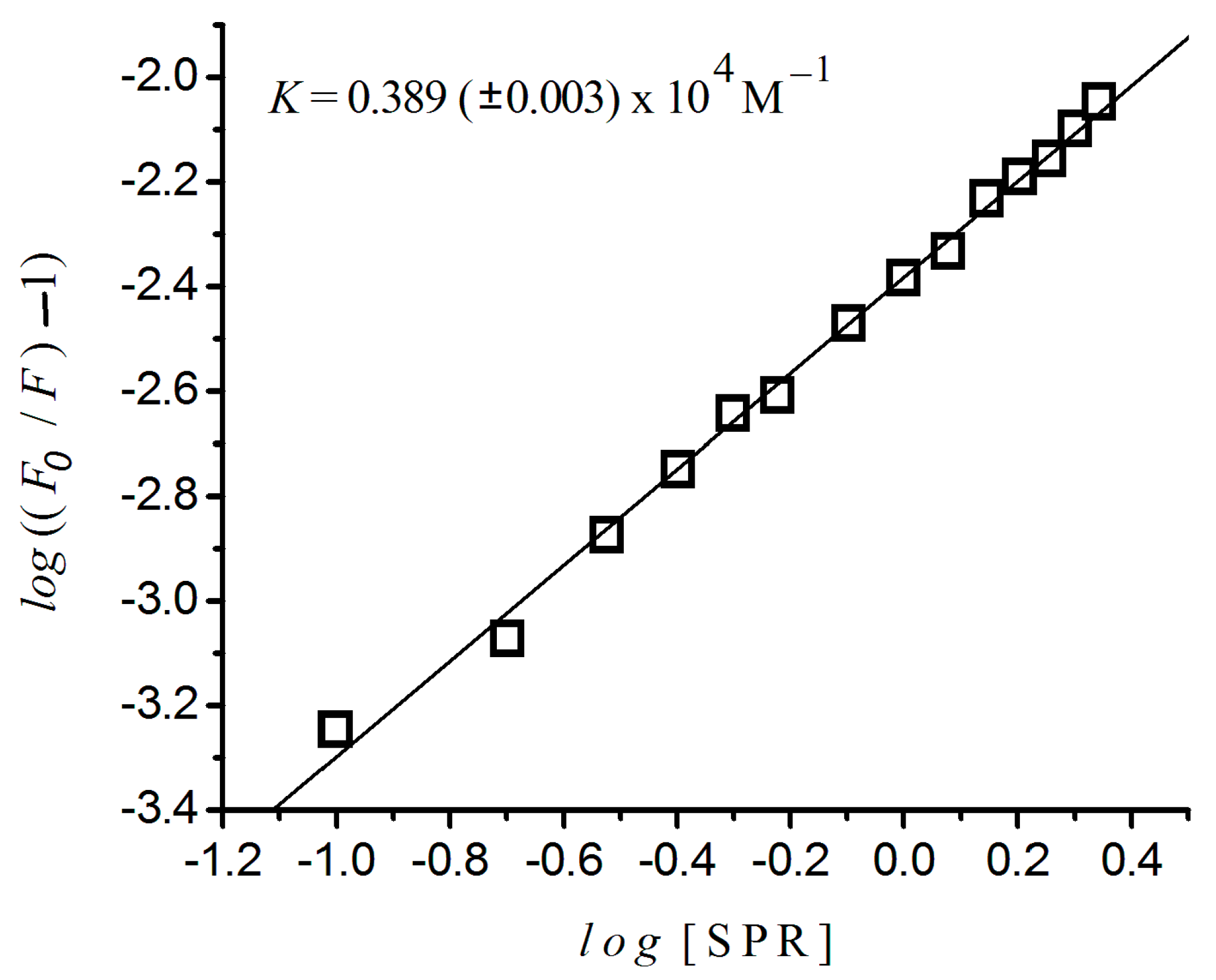 Variation of log((F0/F) − 1) versus log((sulpiride)) for HSA at 37 °C. Excitation λ = 290 nm; (albumin) = 2 × 10−6 M; 10−3 M phosphate buffer, pH 7.4.
