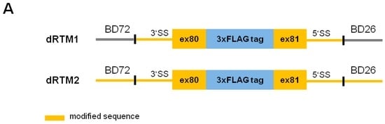 Design of endogenous dRTM1 and dRTM2. (A) For endogenous experiments, the internal GFP sequence of dRTM-GFP was exchanged with the wild-type coding region to introduce the COL7A1 wild-type sequence from exons 80–81. The dRTM contains both selected binding domains (BD72 and BD26) for 3′ and 5′ trans-splicing induction, respectively. Possible cryptic splice sites were deleted within the coding and splicing domain (dRTM1), and the coding, splicing, and binding domains (dRTM2). Modified domains are highlighted in yellow. Additionally, a 3xFLAG tag sequence was included within the coding sequence of dRTM1 and dRTM2 to facilitate the detection of accurate RNA trans-splicing; (B) The sequence alignment was performed with the software “Multiple sequence alignment with hierarchical clustering” [24]. Black nucleotides in dRTM1: original BD72 sequence; blue nucleotides in dRTM2: modified nucleotides in BD72; black nucleotides in dRTM2: additional recognition sites for BamHI (GGATCC) and XhoI (CTCGAG).
