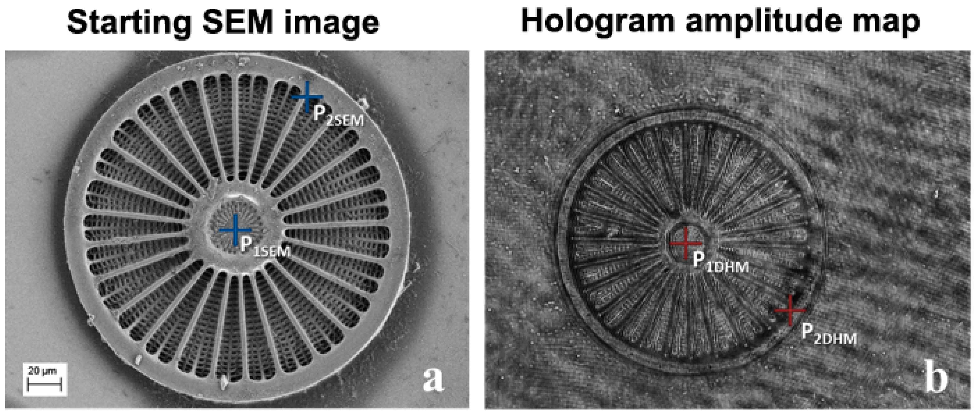 (a) SEM image; (b) Amplitude map obtained by means of DHM of an Arachnodiscous single valve. The P1SEM, P2SEM and P1DHM, P2DHM points (see main text for definition), useful for image alignment, are shown by blue and red crosses, respectively.