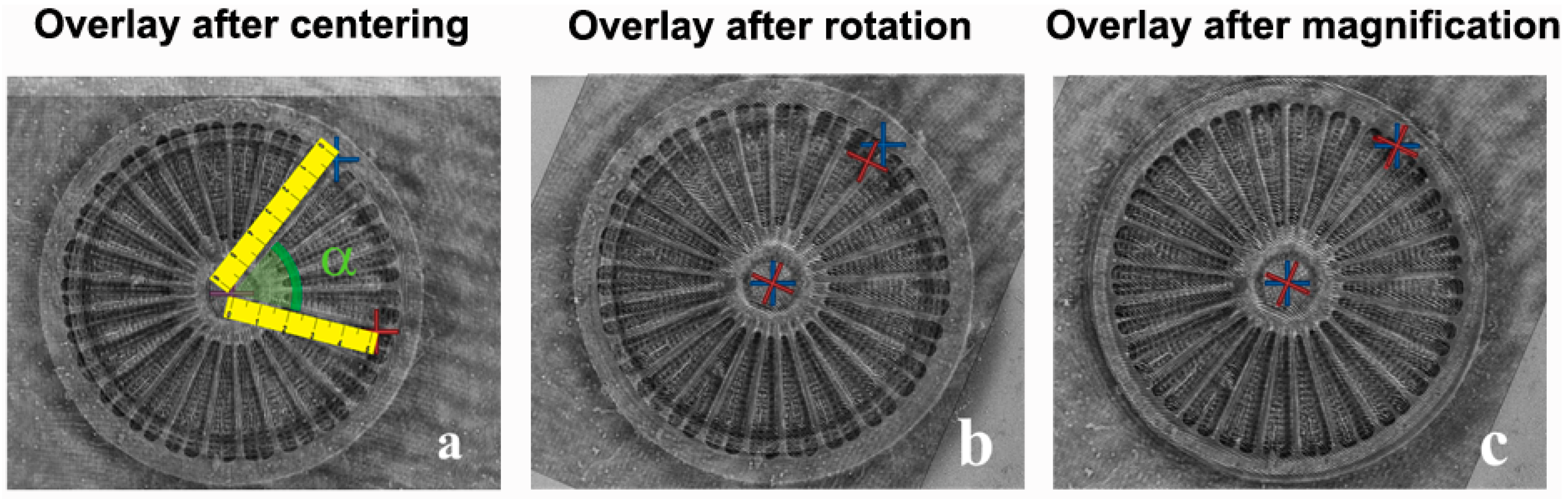 (a) Transparent overlay of the SEM and DHM images after their centering. The pictures underline the different orientation (given by the angle α and sizing of the same valve in the two images; (b)Transparent overlay of the images after rotation; (c) magnification adjustements.