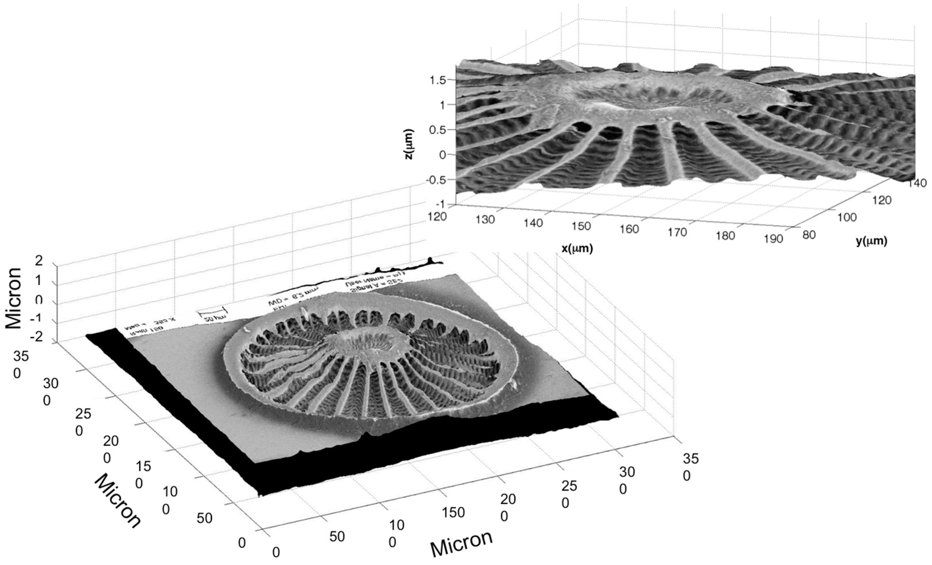 AFM measurements have been performed by means of XE-70 microscope from Park Systems. The instrument is provided with two independent, closed-loop XY and Z flexure scanners for sample and tip, respectively. Flat and linear XY scan of up to 100 × 100 μm with low residual bow is provided. Out of plane motion is less than 2 nm over entire scan range. Z-scan is up to 25 μm by high force scanner. For more details about the materials, in particular for the Arachnoidiscus frustule and the DHM, SEM and AFM methods, we refer to our previous paper recently published [3].