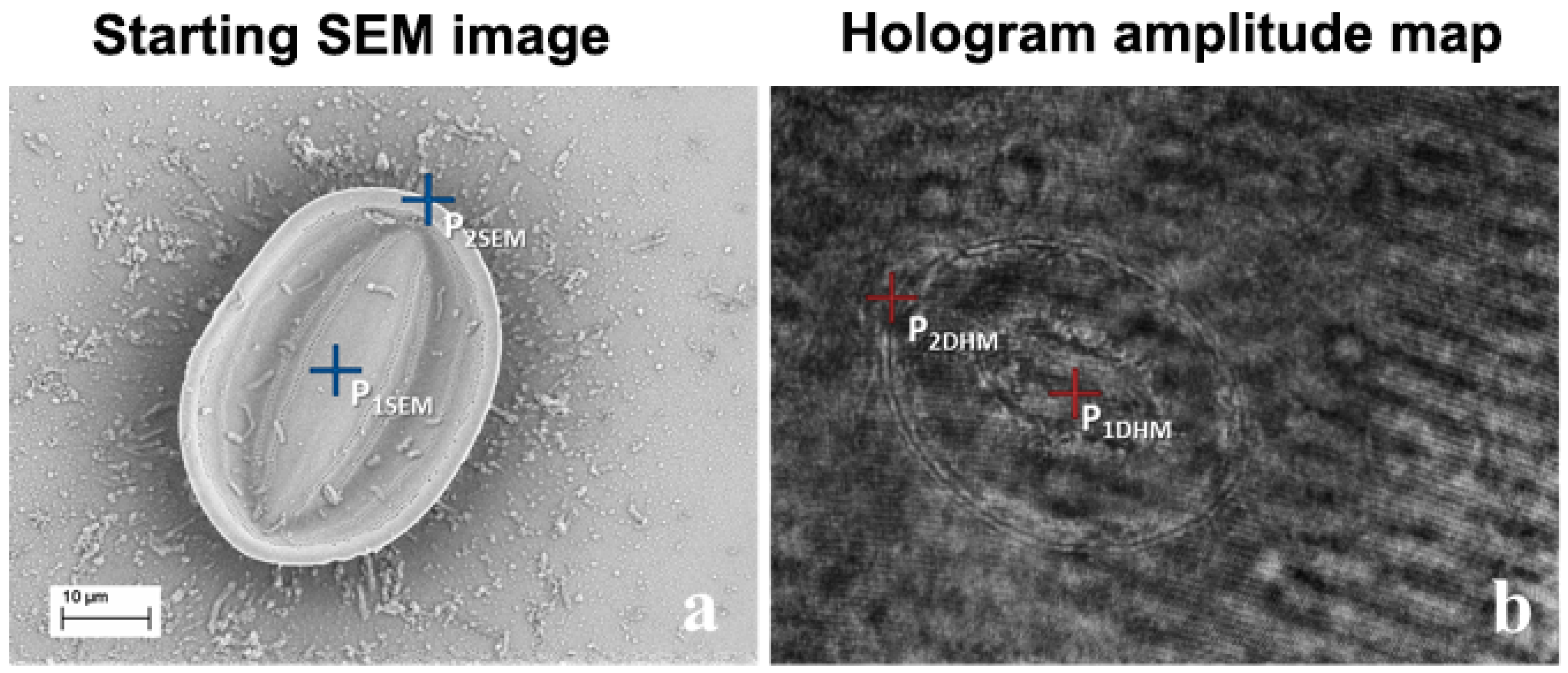 Figure 1 shows both the SEM image of the valve (Figure 1a) and the amplitude map, obtained by means of DHM, of the same valve (Figure 1b). The difference in resolution was noticeable. The four selected points needed to perfectly match the two images of the valve (two points in the amplitude map retrieved by DHM and two corresponding points in the SEM image) are also shown. In both images the central point and a point on the inner crown of the valve were selected.