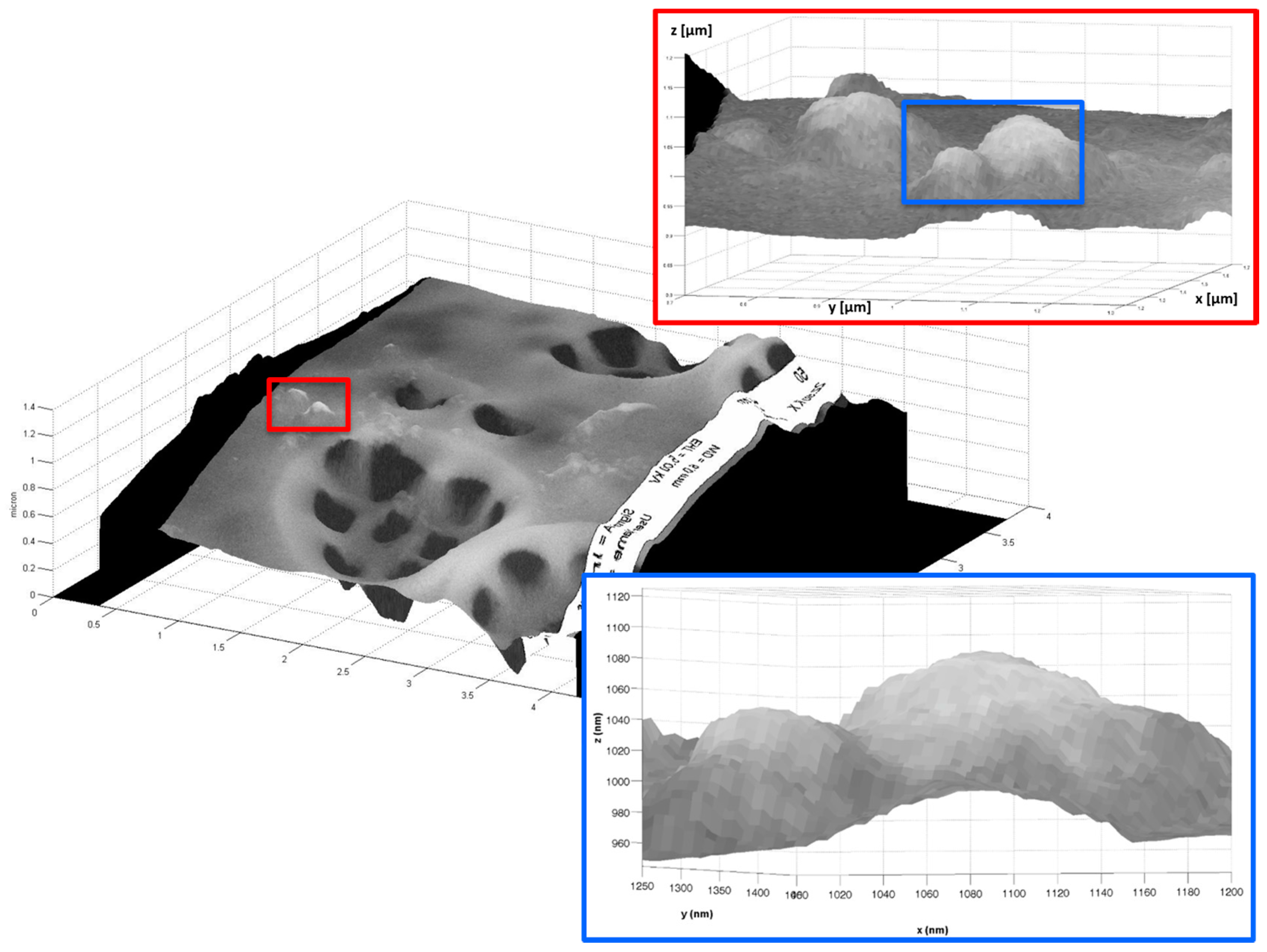 In Figure 6, the merger between AFM and SEM images of a portion of a Coscinodiscus wailesii valve is presented. In particular, in the insets it is clear that nanometric objects are well reconstructed with this technique.