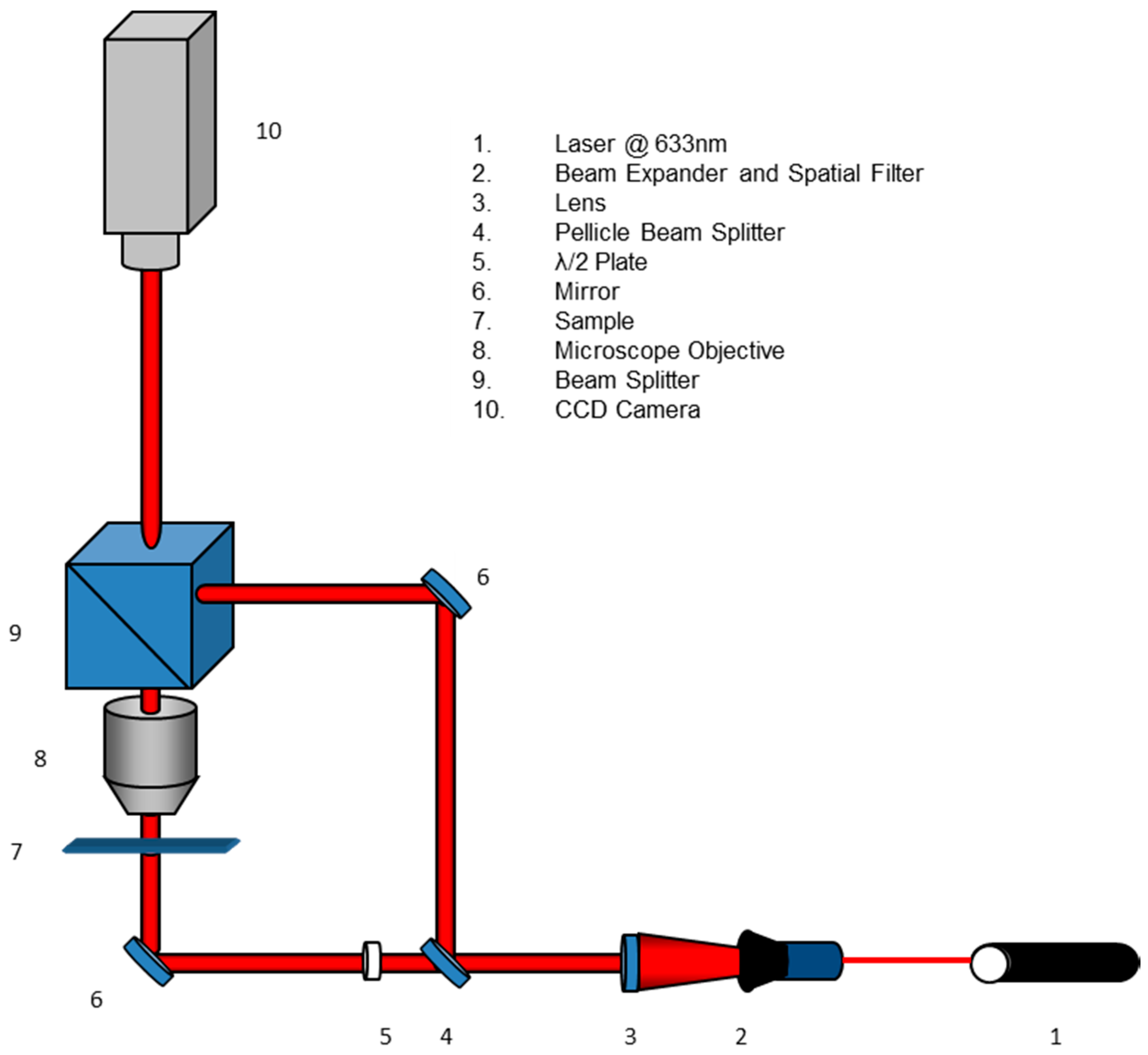The DHM is able to reconstruct objects directly in 3D. Using a laser source with high spatial and temporal coherence in an interferometric configuration, special images, called holograms, with in-plane resolution of the order of microns, are produced. Currently, the DHM is used not only for morphology characterization of many micrometric objects, such as marine diatoms, or cells, but also to reconstruct the light propagation in transparent object [2,3,18,19]. In Figure 7 is reported the sketch of the experimental set-up used for the digital holographic characterization. The laser source was a Helium-Neon laser (λ = 632.8 nm), with an output power of 30 mW in continuous wave (CW). The reference and object beams, obtained by splitting the laser source with a pellicle beamsplitter, were plane wavefronts achieved by a beam expander. A λ/2 wave plate was in the object beam to obtain equal polarization direction for the two beams and, thus, to improve the fringe contrast. The object beam was collected by using a microscope objective with a magnification and numerical aperture (NA) of 10× and NA = 0.25, respectively. The two beams were recombined by a second beamsplitter and the resulting interference pattern has been collected onto the surface of a CCD camera (1392 × 1040 pixels array; each pixel had dimension Δx = Δy = 4.7 µm). The resolution of the 3D model of DHM is related to the microscopy resolution in the xy plane, whereas along z direction (i.e., the light propagation direction) is related to the wavelength (Δz = λ/20).