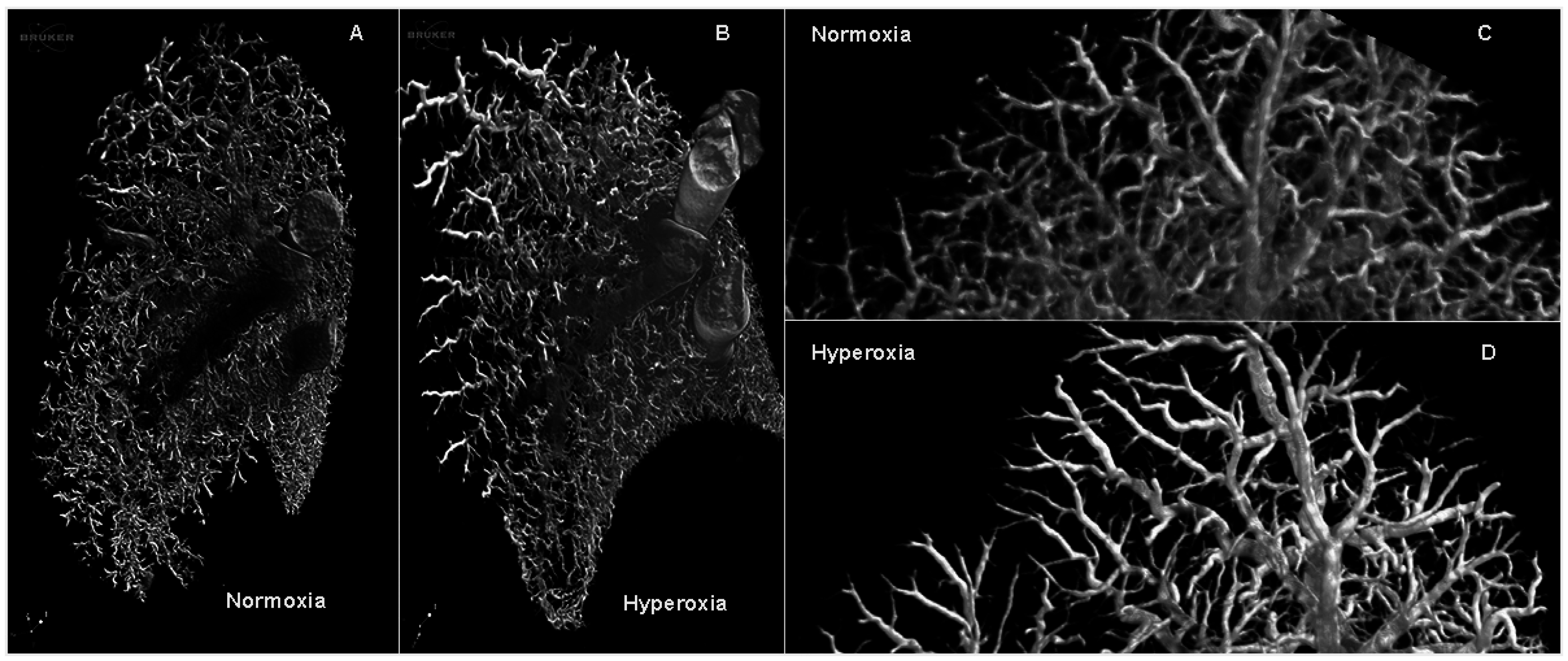 Representative images of Micro-CT of barium angiograms: Barium angiograms showed less distal vascular branches on pups exposed to hyperoxia: (A) Barium angiogram of a left lung of a normoxia exposed pup on day seven; (B) Barium angiogram of a left lung a hyperoxia-exposed pup on day seven; (C) higher detail of Panel A; (D) higher detail of Panel B.