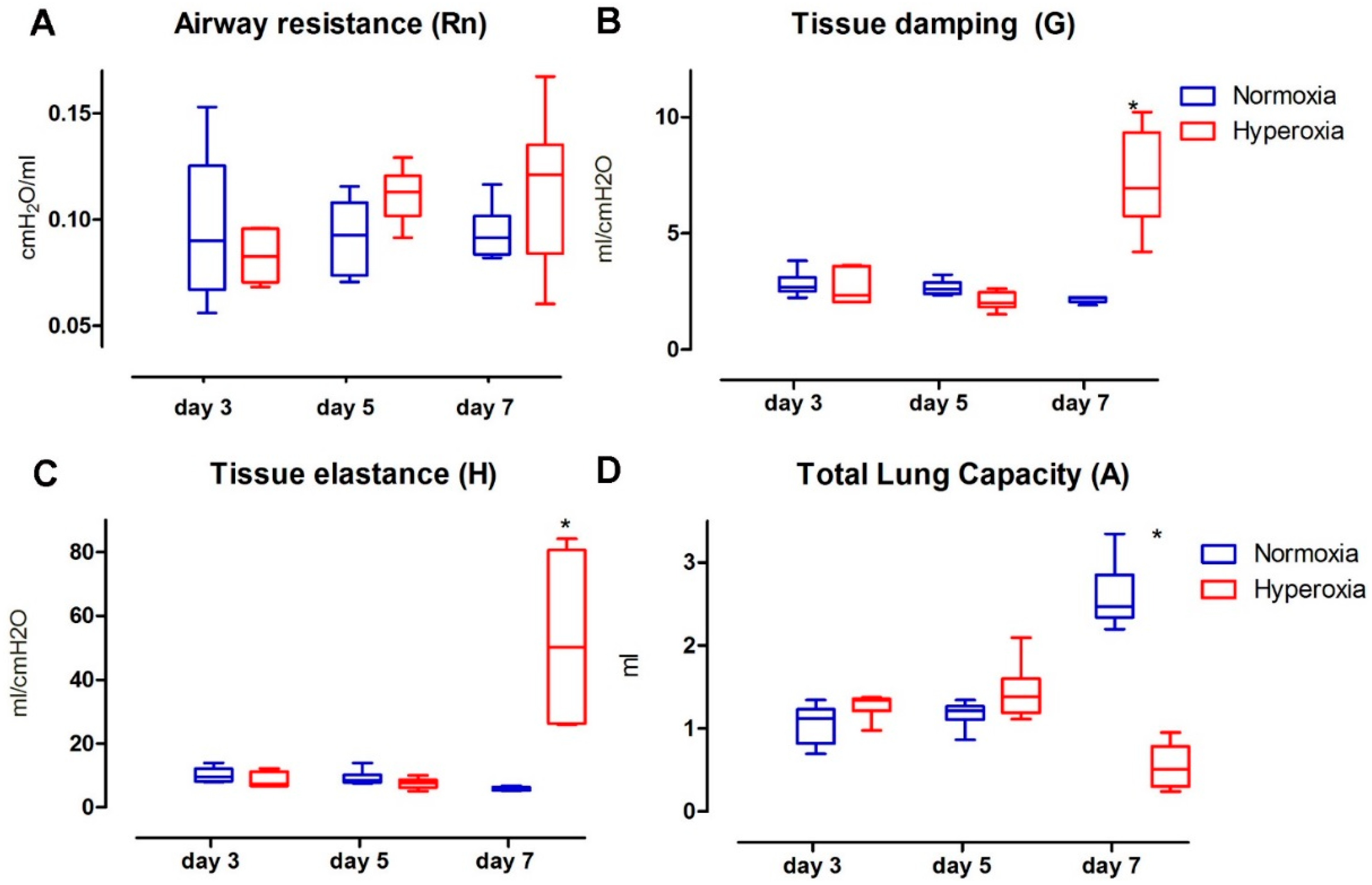 Hyperoxia induced significant and progressive changes in invasive parenchymal functional parameters, while airway resistance (Rn) was not affected by hyperoxia exposure over the studied period (Figure 3A). Rn values did not change over time and were not affected by hyperoxia (interaction p = 0.152; hyperoxia p = 0.262; time p = 0.275).